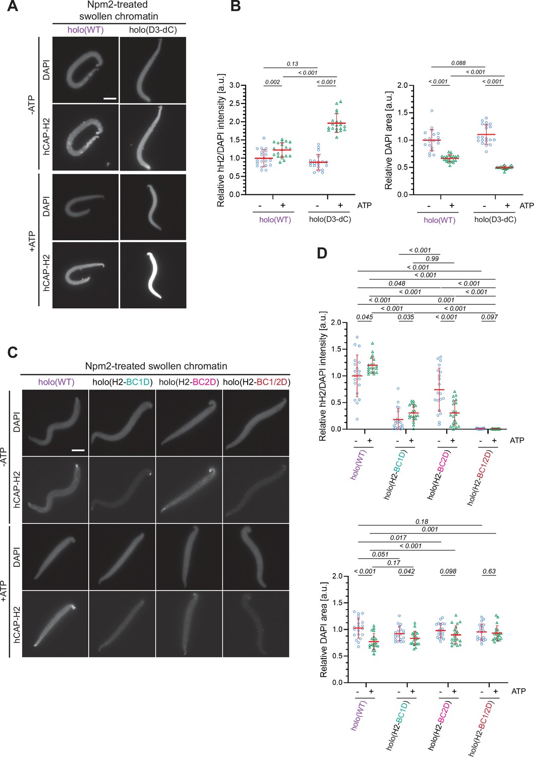 Figure 6—figure supplement 1. Characterization of holo(D3-dC) in an extract-free chromatin binding assay. (A) Xenopus sperm nuclei were pre-incubated with a buffer containing recombinant nucleoplasmin (Npm2) in the absence or presence of ATP for 30 min, and then holo(WT) or holo(D3-dC) was added at 50 nM. After 120 min, reaction mixtures were fixed and labeled with anti-mSMC4 antibody. DNA was counterstained with DAPI. Shown here is a representative image from over 20 nuclei examined per condition. Scale bar, 10 µm. (B) (Left) Signal intensities of hCAP-H2 from the experiment described in (A) were divided by DAPI intensities and the mean values were normalized to values by holo(WT) without ATP addition (-ATP). (Right) Areas of DAPI signals were measured and the mean values were normalized relative to the values by holo(WT) without ATP addition (-ATP). The mean ± SD is shown (n=20 sperm nuclei). P values listed were assessed by two-tailed Welch’s t-test. (C) Xenopus sperm nuclei were pre-incubated with a buffer containing recombinant nucleoplasmin (Npm2) in the absence or presence of ATP for 30 min, and then holo(WT) or a holocomplex harboring either H2-BC1D, H2-BC2D, or H2-BC1/2D mutations was added at 50 nM. After 120 min, reaction mixtures were fixed and labeled with anti-mSMC4 antibody. DNA was counterstained with DAPI. Shown here is a representative image from over 20 nuclei examined per condition. Scale bar, 10 µm. (D) (Left) Signal intensities of hCAP-H2 from the experiment described in (C) were divided by DAPI intensities and the mean values were normalized to the values by holo(WT) without ATP addition (-ATP). (Right) Areas of DAPI signals were measured and the mean values were normalized relative to the values by holo(WT) without ATP addition (-ATP). The mean ± SD is shown (n=20 sperm nuclei). P values listed were assessed by two-tailed Welch’s t-test. SMC, structural maintenance of chromosomes; WT: wild-type. |