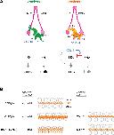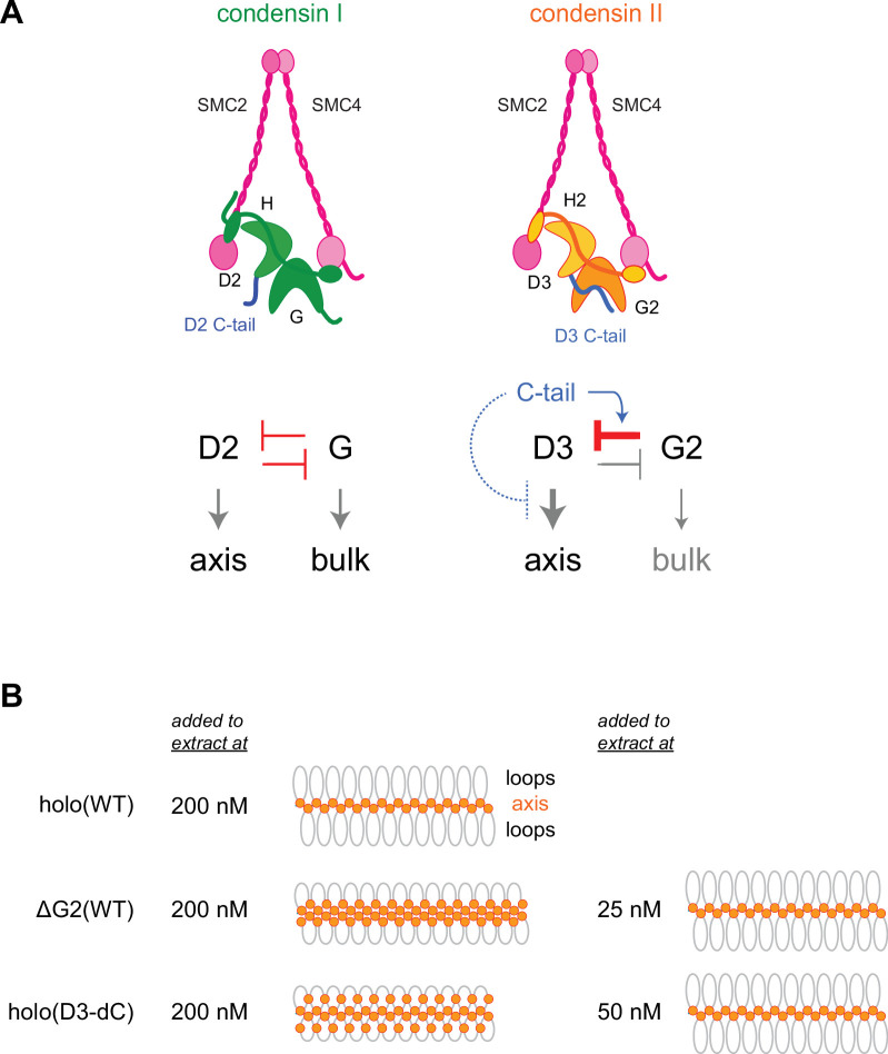 Figure 7. Model of condensin II regulation.(A) Comparison between condensin I and condensin II. In condensin I, the two HEAT subunits, CAP-D2 and CAP-G, contribute to axis assembly and bulk loading, respectively, and their balancing acts regulate proper chromosome assembly. In condensin II, although CAP-D3 and CAP-G2 contribute to axis assembly and bulk loading, respectively, their balancing acts are modified differently from condensin I: CAP-D3’s role in axis assembly is dominant over CAP-G2’s role in bulk loading, whereas CAP-G2’s function to negatively regulate CAP-D3’s function is prominent (bar-headed arrow shown in red). The CAP-D3 C-tail could negatively regulate CAP-D3’s action through CAP-G2-dependent (blue arrow shown in blue) and CAP-G2-independent mechanisms (bar-headed arrow shown in blue). (B) A schematic representation of the chromosome morphologies formed by holo(WT), ΔG2(WT), and holo(D3-dC) in Xenopus egg extracts. Holo(WT) added at 200 nM localizes at the axis and forms chenille-like chromosomes with large loops. ΔG2(WT) and holo(D3-dC) form similar chenille-like chromosomes at lower doses (at 25 nM and 50 nM, respectively). At 200 nM, ΔG2(WT) greatly accumulates at the axis and elongates the axis while keeping the chenille-like morphology. In contrast, holo(D3-dC), when added at 200 nM, also associates with non-axial regions to support lateral compaction, resulting in the formation of a rod-like chromosome. |