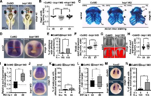 Fig 2. bop1 knockdown leads to a cranial cartilage phenotype. A The head width on the injected side (red line) of embryos at stage 42 injected with bop1 MO and Control MO was compared with the head width on the uninjected side (blue line). The head was significantly smaller upon bop1 knockdown. B Statistical evaluation of data given in A. The head phenotype was rescued by co-injecting bop1 MO with 0.5 ng of Î5âUTR-bop1 RNA. C Ventral view of Alcian blue- stained cranial cartilages of stage 45 embryos showed a reduced cartilage upon bop1 knockdown. The middle cartilage depicts a mild phenotype and the right one, a severe phenotype. Branchial arches (ba), Meckel Ìs cartilage (mc), tectum anterius (ta) were severely affected (black arrows). D sox3 served as pan-neural marker gene at stage 13 and was analyzed upon bop1 and Control MO injection. Anterior view of embryos is given. The width of sox3 expression on the injected side (red line) of bop1 MO- and Control MO-injected embryos at stage 13 was compared with the width on the uninjected side (blue line). E sox3 expression significantly increased in Xenopus embryos upon bop1 MO injection. F Statistical evaluation of data given in D showing an increased width of sox3 expression in bop1 morphants. G sox3 expression was analyzed in stage 13 bop1 morphants and control embryos (anterior view is shown). Expression domain was photographed and area was measured via ImageJ. Black boxes indicate area where sox3 expression (red area) was measured. Injected side was compared to uninjected side. H sox3 expression is significantly increased in bop1 morphants. Control MO injection did not alter sox3 expression. I Relative sox3 gene expression was analyzed using real-time qPCR in bop1 MO and Control MO bilaterally injected embryos at stage 13. sox3 expression was normalized to gapdh, odc, and slc35b1 and was significantly increased upon bop1 knockdown compared to control MO injection. J Anterior view of embryos is given. Expression of sox2 was analyzed upon bop1 MO and Control MO injection at stage 13. Neither bop1 MO nor Control MO injection affected sox2 expression. K Statistical analysis of data shown in J. L Relative sox2 gene expression was analyzed using real-time qPCR in bop1 MO and Control MO bilaterally injected embryos at stage 13. sox2 expression was normalized to gapdh, odc, and slc35b1 and was not affected upon bop1 knockdown. M The marker gene foxd3 in anterior neural crest cells in stage 17 embryos injected with 20 ng of bop1 MO or Control MO (black arrow indicates location of altered gene expression). N Around 40% of bop1 MO-injected embryos showed a reduced expression of foxd3 upon bop1 MO injection, but Control MO injection did not show any effect on foxd3 expression. Abbreviations: ba, branchial arches; bop1 MO, block of proliferation 1 morpholino oligonucleotide; CoMO, Control MO; inj., injected side; mc, Meckel Ìs cartilage; MO, morpholino oligonucleotide; n, number of independent experiments; N, number of injected and analyzed embryos; n.s., non- significant; ta, tectum anterius; uninj., uninjected side. bop1 is the Î5âUTR-bop1 RNA used for rescues. Error bars indicate standard error of the means; Whiskers indicate in I and L minimum and maximum. |