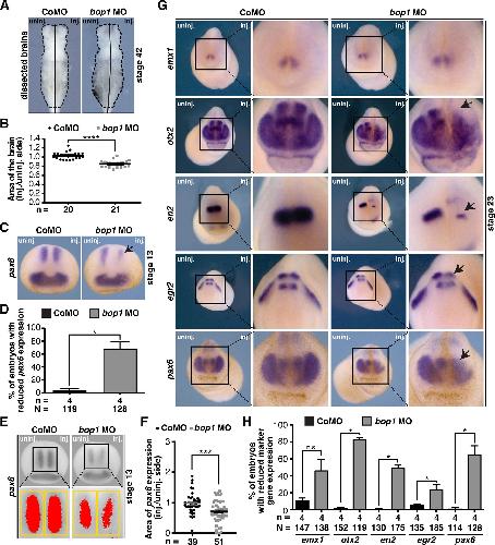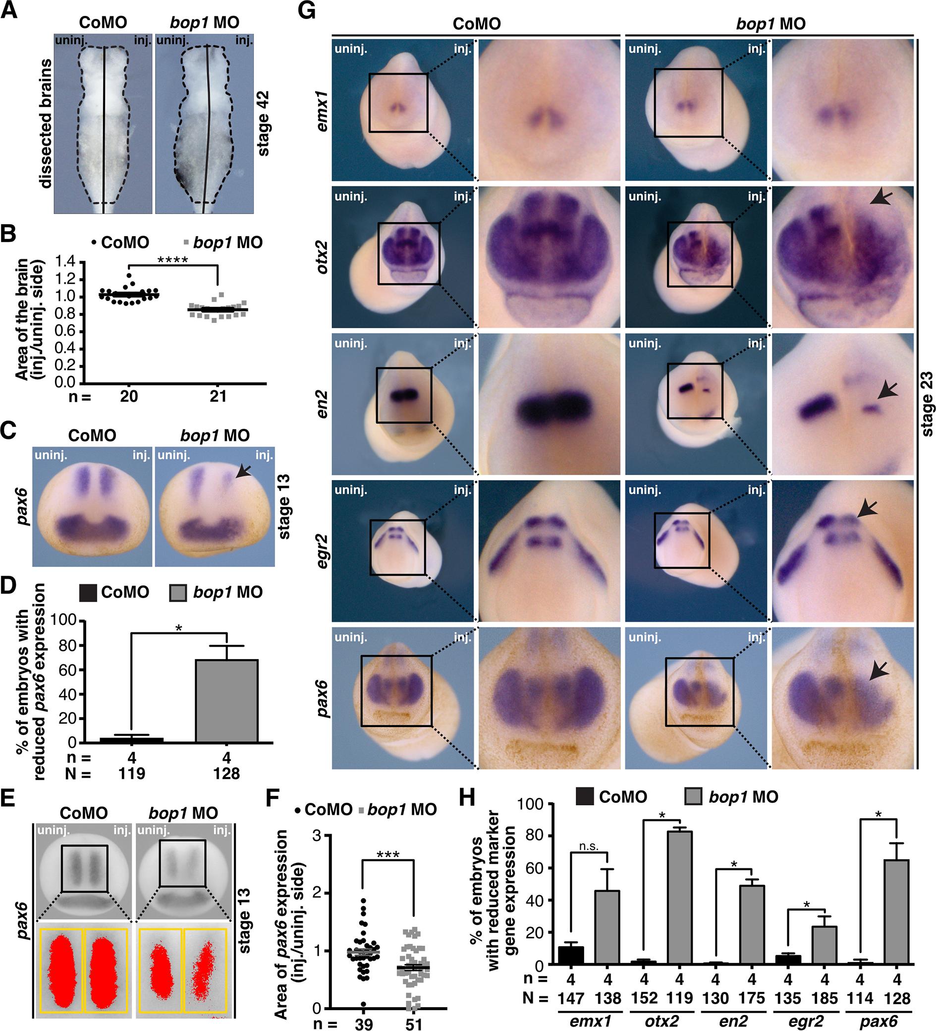 Fig 3. Bop1 is necessary for brain development in Xenopus laevis. A Sides of embryo brains injected with bop1 MO and Control MO and uninjected sides were compared (ventral view). B Statistical evaluation showed that bop1 knockdown led to a significantly smaller area of the brain. C Xenopus embryos were injected with either 20 ng bop1 MO or Control MO, and pax6 expression in the anterior neural tube was investigated at stage 13 (black arrow indicates location of reduced gene expression). pax6 expression was decreased upon bop1 knockdown. D Statistical evaluation of data given in C. E Area of pax6 expression was investigated at stage 13 embryos via ImageJ. Expression domain was photographed and injected side was compared to uninjected side. Yellow boxes indicate area in which pax6 expression (red area) was measured. F Statistical analysis confirmed reduction of pax6 expression upon bop1 knockdown. G Brain-specific marker genes were analyzed in stage 23 embryos. Embryos were injected with 20 ng bop1 MO or Control MO. Black arrows indicate location of reduced gene expression. H As shown by statistical evaluation, upon bop1 knockdown expression of otx2, en2, egr2, and pax6 was significantly decreased. Control MO- injected embryos showed normal gene expression. Abbreviations: bop1 MO, block of proliferation 1 morpholino oligonucleotide; CoMO, Control MO; inj., injected side; n, number of independent experiments; N, number of injected and analyzed embryos; n.s., non-significant; uninj., uninjected side. Error bars indicate standard error of the means; |
