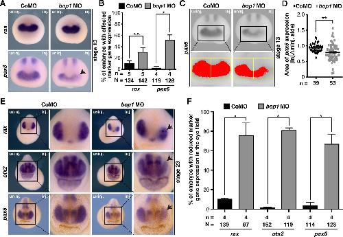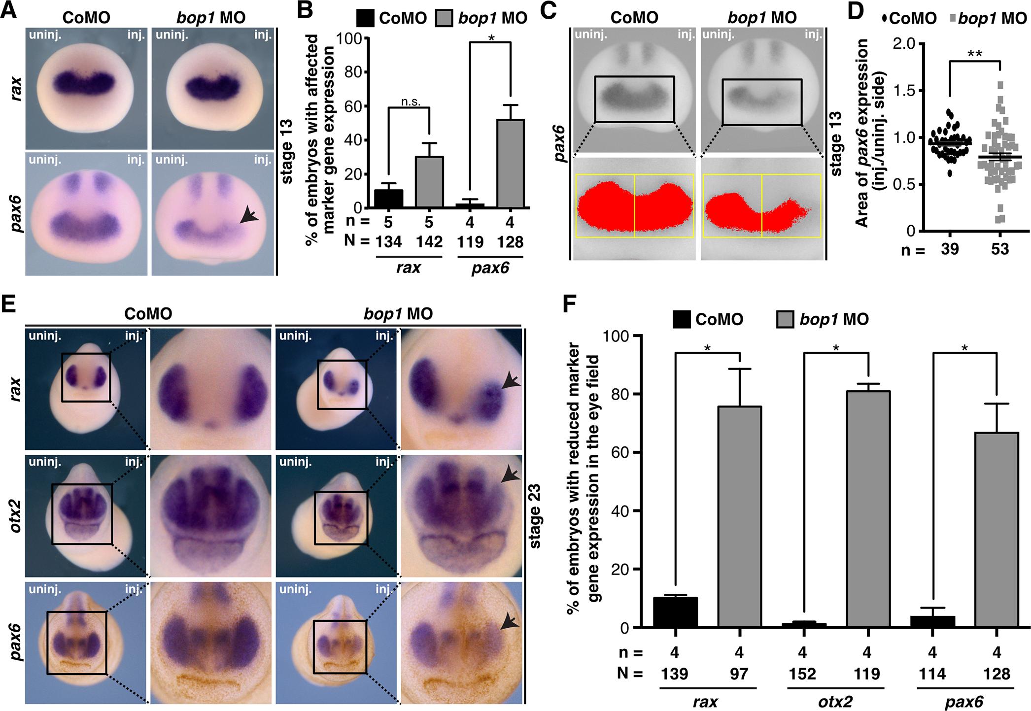 Fig 6. Eye-specific marker genes upon Bop1 deficiency. A Xenopus laevis embryos at stage 13 injected with 20 ng bop1 MO or Control MO and analyzed by whole mount in situ hybridization. rax and pax6 served as eye-specific marker genes (black arrow indicates location of altered gene expression). Anterior view of embryos is given. B Quantitative representation of data given in A. C pax6 expression was analyzed in stage 13 bop1 morphants (anterior view is shown). Expression domain was photographed and area was measured via ImageJ. Injected side was compared to uninjected side. Yellow boxes indicate area where pax6 expression (red colored area) was measured. D pax6 expression is significantly reduced on the injected side of bop1 MO-injected embryos. E Stage 23 embryos injected with 20 ng bop1 MO or Control MO. Anterior view is given. rax, otx2, and pax6 were used as eye-specific marker genes (black arrows indicate the location of the altered gene expression). F The expression of all three marker genes was significantly reduced in bop1 morphants. Abbreviations: bop1 MO, block of proliferation 1 morpholino oligonucleotide; CoMO, Control MO; inj., injected side; n, number of independent experiments; N, number of injected and analyzed embryos; n.s., non-significant; uninj., uninjected side. Error bars indicate standard error of the means; |