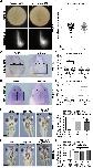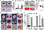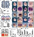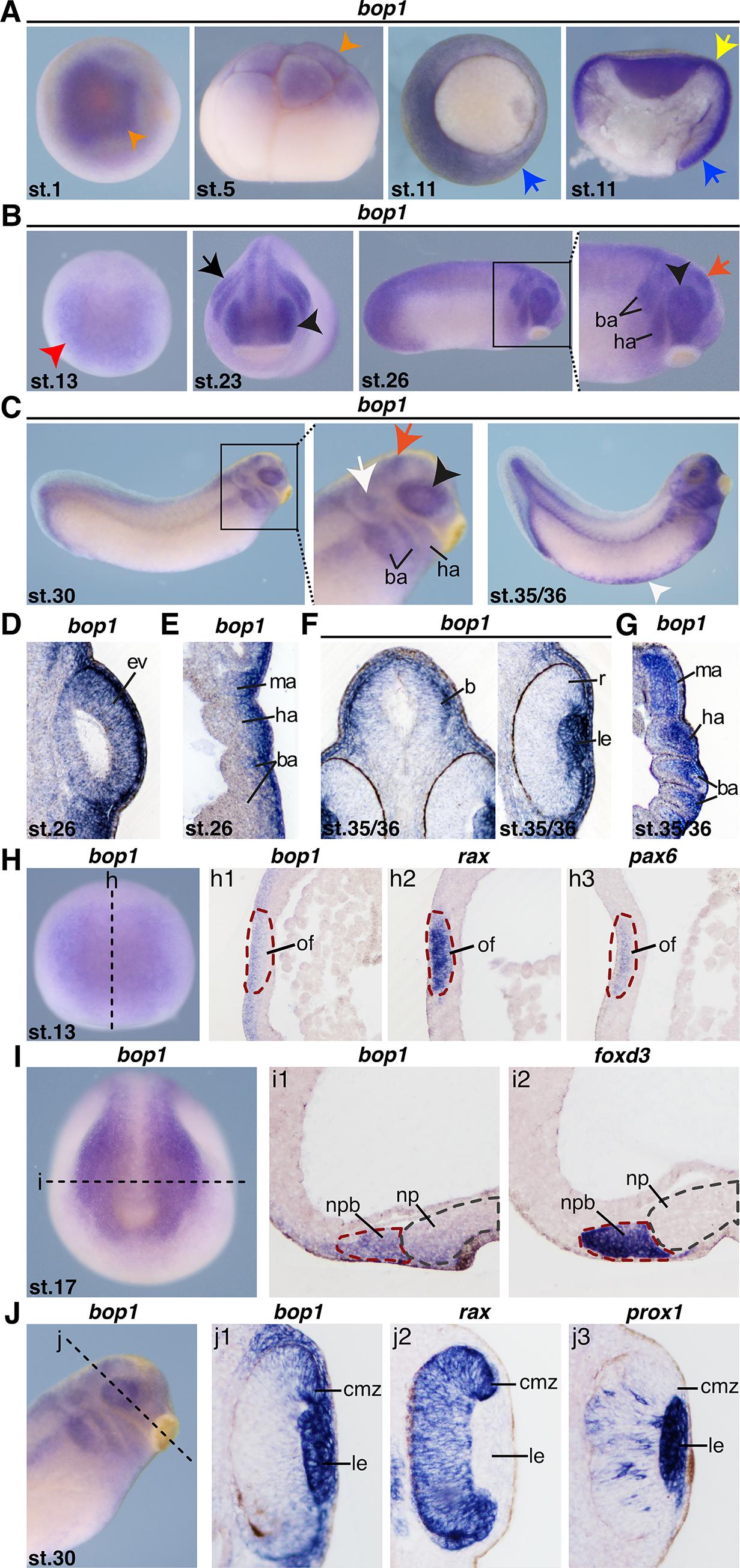 Fig 1. bop1 expression in Xenopus laevis embryos. A bop1 expression visualized by whole mount in situ hybridization in embryos at the indicated stages. Animal (st. 1), lateral (st. 5), and vegetal (st. 11) views and a sagittal section (st. 11) are shown. At stage 1 and stage 5, bop1 was expressed at the animal pole (orange arrowhead). During gastrulation (st. 11), bop1 expression occurred in the mesoderm surrounding the blastoporus (yellow and blue arrow). B, C Anterior (st. 13 and 23) and lateral (st. 26, st. 30, and st. 35/36) views are shown. At stage 13, bop1 expression was found in the anterior neural plate (red arrowhead). Stage 23 and stage 26 embryos showed expression in the developing eye (black arrowhead), the migrating neural crest cells (NCCs) (black arrow), and the brain (red arrow). At tailbud stages, embryos expressed bop1 in the developing eye (black arrowhead), the brain (red arrow), the branchial (ba) and hyoid arches (ha), the otocyst (white arrow), the blood islands (white arrowhead), and the tail bud. D bop1 expression was shown in the developing eye (transversal section, orientation: Dorsal (upper part) to ventral (lower part)). E, G bop1 expression was shown in the branchial, hyoid, and mandibular arches (ma) (horizontal sections, orientation: Anterior (upper part) to posterior (lower part)). F Embryos expressed bop1 in the brain (b) and in the lens (le) (transversal section, orientation: Dorsal (upper part) to ventral (lower part)). H Expression of bop1 and the two eye-specific marker genes rax and pax6 at stage 13. The black dotted line indicates the level of sagittal sections in h1-h3 (section orientation is dorsal (upper part) to ventral (lower part)). bop1 expression was detected in the optic field (of) (red dotted circle), as was rax and pax6 expression. I Expression of bop1 and the NCC marker gene foxd3 at stage 17. The black dotted line in the left-hand panel represents the level of horizontal sections in i1 and i2 (section orientation is posterior (upper part) to anterior (lower part)). bop1 transcripts were located in the neural plate border positive for foxd3 (nbp) (red dotted line). The grey dotted line in the middle and right-hand panels represents the neural plate (np). J Expression of bop1 and the two eye-specific marker genes rax and prox1 at stage 30. The black dotted line indicates the level of transversal sections shown in j1-j3 (section orientation is dorsal (upper part) to ventral (lower part)). bop1 was expressed in the lens and the ciliary marginal zone (cmz), where retinal progenitor cells are located. Abbreviations: b, brain; ba, branchial arches; cmz, ciliary marginal zone; ev, eye vesicle; ha, hyoid arches; le, lens; ma, mandibular arches; NCC, neural crest cell; np, neural plate; nbp, neural plate border; of, optic field; r, retina; st., stage; WMISH, whole mount in situ hybridization. |