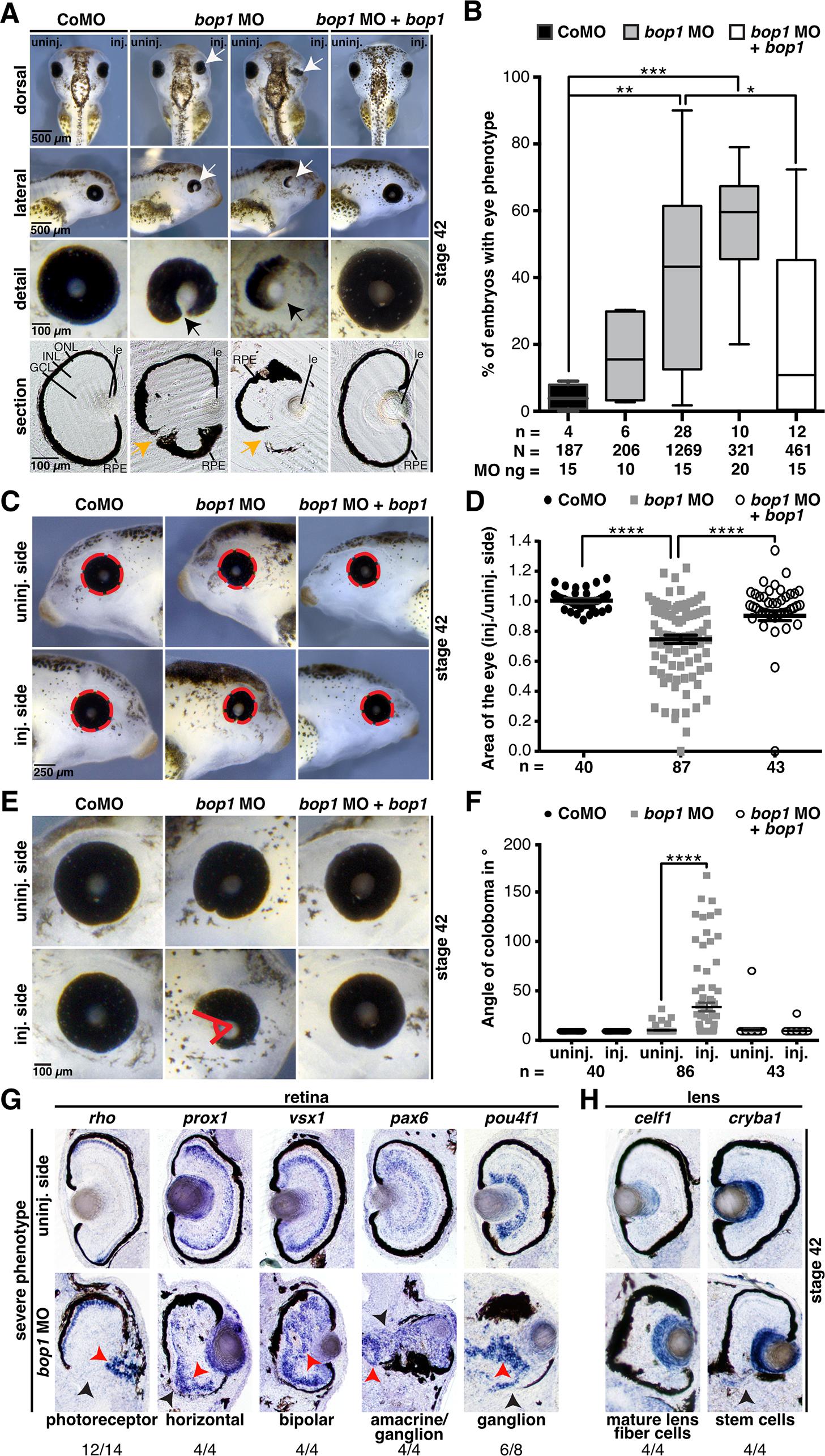 Fig 4. bop1 knockdown impairs proper eye development. A Sides injected with bop1 MO and Control MO were compared with uninjected sides of embryos. Knockdown of bop1 led to a severe eye phenotype with underdeveloped or malformed eyes (white arrows). A detailed view of the deformed eyes is depicted (black arrows). Vibratome sections showed a deformed retinal pigmented epithelium (RPE) (orange arrows). Control MO-injected embryos showed no eye phenotype. B Statistical evaluation of data given in A. Embryos with Bop1 suppression developed a significantly smaller eye than Control MO-injected embryos. The phenotype increased in a dose-dependent manner and was rescued by co-injecting 0.5 ng of Î5âUTR-bop1 RNA. C The area of the eye was measured (red dotted circles). Control MO- and bop1 MO-injected sides were compared with uninjected sides. D bop1 knockdown led to significantly smaller eyes. The size of the eye was rescued by co-injecting Î5âUTR-bop1 RNA. E Measurement of the angle of eye fissures (indicated by red angle). F Statistical analysis of the angle of eye fissures showed that bop1 MO-injected embryos developed colobomas. The coloboma phenotype was rescued by co-injecting bop1 MO with Î5âUTR-bop1 RNA. G Vibratome sections of bop1 MO-injected embryos showing a severe eye phenotype. Red arrows point to disrupted cell layers of indicated cell types, and black arrows point to disrupted RPE. Specific marker genes for cell layers were used, as described in the main text. Most of the cell types were displaced and disorganized. H Lens-specific cells were unimpaired upon suppression of Bop1. Vibratome sections of embryos showing a severe eye phenotype. The lens-specific marker genes celf1 and cryba1 were used. Some lens fiber cells and stem cells were mildly displaced, but they showed no reduction in expression. Numbers below the columns indicate the number of embryos showing the depicted phenotypes per number of embryos analyzed. Abbreviations: bop1 MO, block of proliferation 1 morpholino oligonucleotide; CoMO, Control MO; GCL, ganglion cell layer; inj., injected side; INL, inner nuclear cell layer; le, lens; n, number of independent experiments; N, number of injected and analyzed embryos; ONL, outer nuclear cell layer; RPE, retinal pigmented epithelium; uninj., uninjected side. bop1 is the Î5âUTR-bop1 RNA used for rescues. Error bars indicate standard error of the means; Whiskers in B indicate minimum and maximum. |