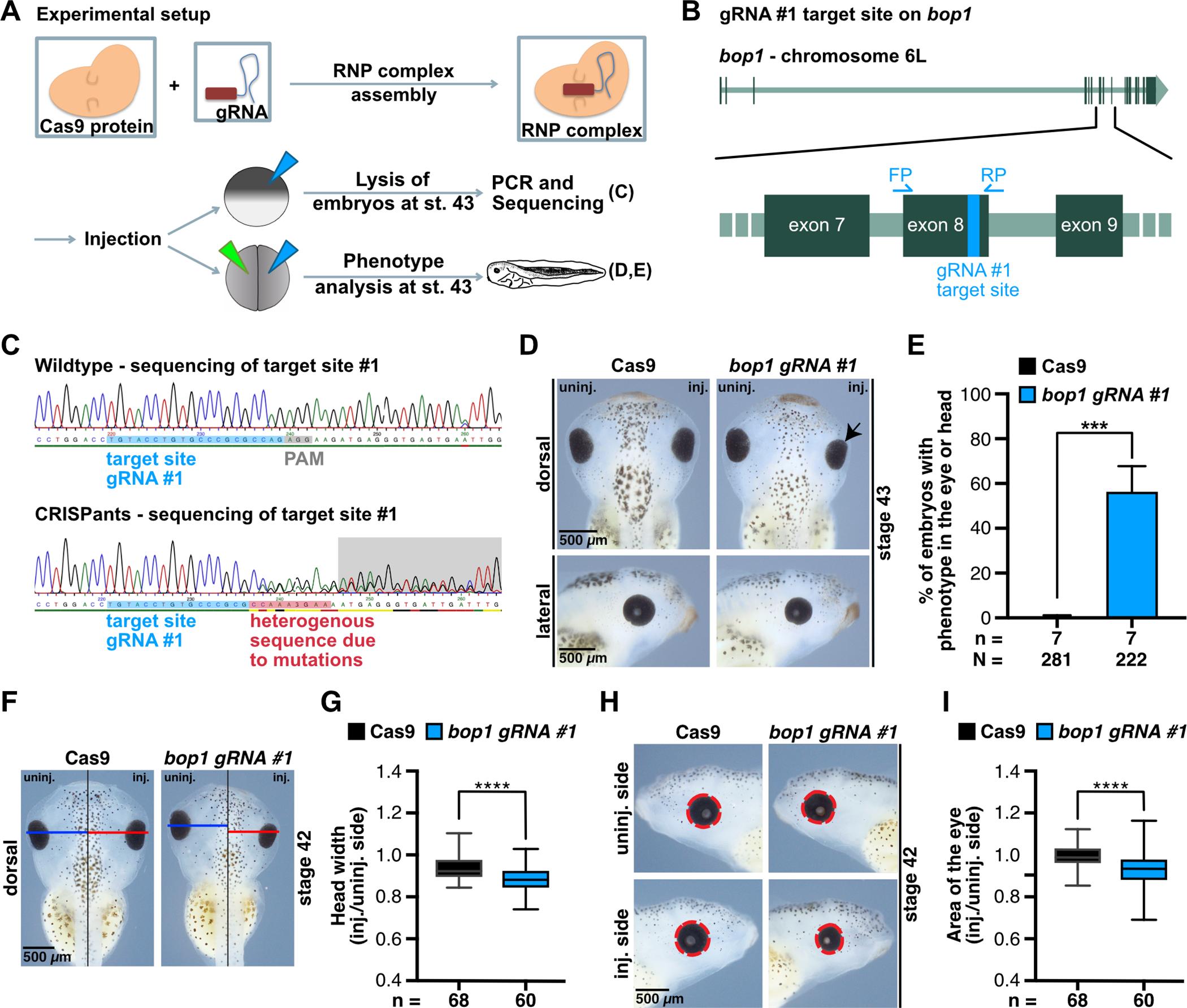 Fig 5. bop1 knockout using the CIRSPR/Cas9 system. A Experimental setup of CRISPR/Cas9 gene editing experiments. Cas9 protein was pre-assembled with bop1 gRNA #1 to build ribonucleoprotein (RNP) complex. Embryos were injected at one-cell stage for sequencing analysis. Embryos were injected at two-cell stage for phenotypic analysis. B Target site of gRNA #1 on bop1 exon 8. Here shown for chromosome 6L âoff note, there are no mismatches between target site on homeologue L and S. C DNA pools of 10 wildtype embryos or 10 bop1 CRISPants were sequenced. Target site of bop1 gRNA #1 is highlighted in blue, protospacer adjacent motif (PAM) sequence in grey, and heterogenous sequence in CRISPants DNA pool in red. CRISPR/Cas9 system successfully introduced mutations. D Injection of bop1 gRNA #1 resulted in smaller eyes (indicated with black arrow) and smaller heads on the injected side, whereas injection of Cas9 protein alone did not affect anterior development. E Statistical analysis of data shown in D. F The head width of the injected side (red line) was compared to the width of the uninjected side (blue line). Black line indicates the midline of the embryo. G Knockout of bop1 led to significantly narrower heads on the injected side. H Area of the eye on the injected side was compared to the area of the eye on the uninjected side. Measured area is indicated by red dotted line. I bop1 CRISPants showed a significantly reduced eye area. Cas9 protein alone did not affect the area of the eye. Abbreviations: bop1 gRNA #1, block of proliferation 1 guide RNA #1; Cas9, CRISPR-associated protein 9; CRISPR, clustered regularly interspaced short palindromic repeats; inj., injected side; n, number of independent experiments; N, number of injected and analyzed embryos; PAM, protospacer adjacent motif; PCR, polymerase chain reaction; RNP, ribonucleoprotein; uninj., uninjected side. Error bars indicate standard error of the means; Whiskers in G and H indicate minimum and maximum. |