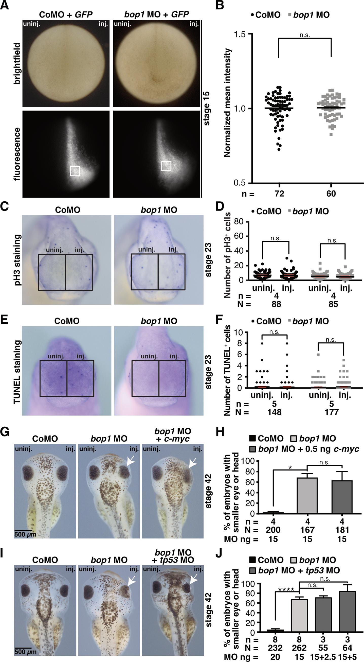 Fig 7. bop1 knockdown affects neither cell proliferation nor apoptosis. A Embryos were injected with Control or bop1 MO together with 1 ng GFP RNA. At stage 15, embryos were photographed using a fluorescence microscope (8-bit greyscale). Intensity of GFP was analyzed by measuring the mean grey value in the indicated areas (white boxes). Mean intensities were normalized to the control group. Anterior view of embryos is given. B GFP intensity did not differ between Control MO and bop1 MO-injected embryos. C Anterior view of embryos is shown. Phospho histone 3 (pH3) staining of stage 23 embryos showed no difference upon injection of Control MO or bop1 MO. D Statistical analysis of data given in C. E Anterior view of embryos is shown. Terminal deoxynucleotidyl transferase dUTP nick end labeling (TUNEL) staining of stage 23 embryos revealed no difference between Control MO- and bop1 MO- injected embryos. F Statistical evaluation of data given in E. G Embryos were injected with Control MO, bop1 MO, or bop1 MO + 0.5 ng c-myc RNA. At stage 42, embryos were analyzed regarding a phenotype of the anterior tissue. Injected side was compared to uninjected side. White arrows indicate smaller eyes. H Statistical analysis of data shown in G reveals that a rescue of the bop1 MO-induced phenotype is not possible by co-injection of 0.5 ng c-myc RNA. I Embryos were injected with Control MO, bop1 MO, or bop1 MO + tp53 MO and analyzed at stage 42 regarding a phenotype of the anterior tissue. Co-suppression of Bop1 and Tp53 did not rescue the bop1 knockdown-associated phenotype. J Statistical analysis of data given in I. Abbreviations: bop1 MO, block of proliferation 1 morpholino oligonucleotide; c-myc, MYC proto-oncogene; CoMO, Control MO; GFP, green fluorescent protein; inj., injected side; MO, morpholino oligonucleotide; n, number of independent experiments; N, number of injected embryos and analyzed; n.s., non-significant; pH3, phospho histone 3; tp53, tumor protein p53; TUNEL, terminal deoxynucleotidyl transferase dUTP nick end labeling; uninj., uninjected side. Error bars indicate standard error of the means; |