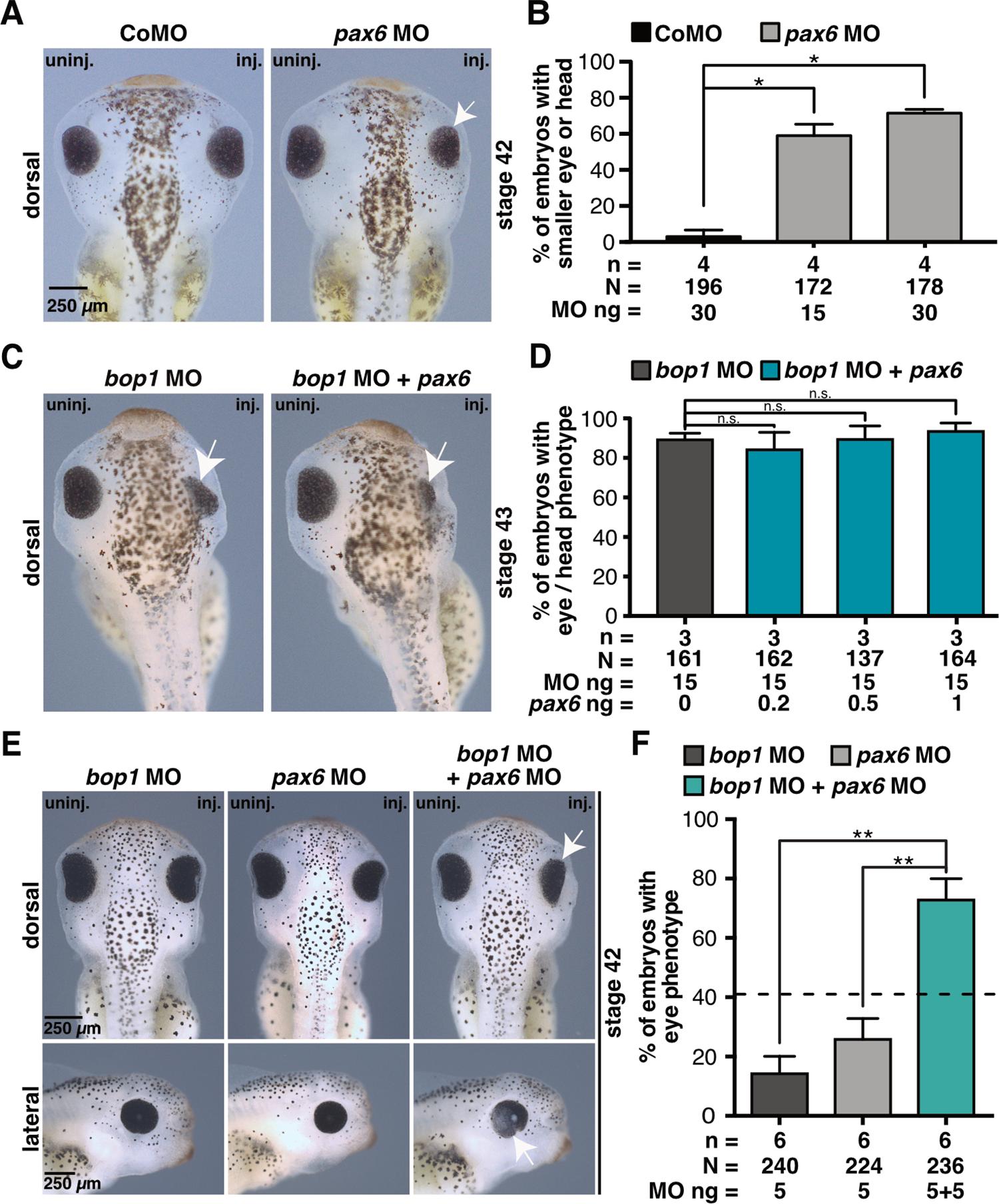 Fig 8. Pax6 and Bop1 act in the same signaling pathway. A Xenopus laevis embryos were injected with 30 ng Control MO and 15 ng or 30 ng pax6 MO at eight-cell stage into one animal-dorsal blastomere. At stage 42, embryos were analyzed regarding a phenotype of the anterior tissue. pax6 MO injection resulted in smaller heads and eyes (white arrows). B Statistical evaluation of data given in A. C Embryos were injected at eight-cell stage with bop1 MO alone or in combination with pax6 RNA. Embryos were fixed at stage 42 and analyzed phenotypically. Smaller eyes are indicated with white arrow. D Injection of bop1 MO alone or in combination with pax6 RNA resulted in severe eye phenotypes. E Injection of 5 ng bop1 MO or 5 ng pax6 MO led to a mild eye phenotype in 15% and 27% of the embryos, respectively. The co-injection of both 5 ng bop1 MO and 5 ng pax6 MO resulted in a severe eye phenotype in a more than additive manner (73%). F Statistical analysis of data given in E. Black dotted line indicates sum of embryos showing an eye or head phenotype injected with 5 ng bop1 MO and 5 ng pax6 MO. Abbreviations: bop1 MO, block of proliferation 1 morpholino oligonucleotide; CoMO, Control MO; inj., injected side; MO, morpholino oligonucleotide; n, number of independent experiments; N, number of injected and analyzed embryos; n.s., non-significant; pax6 MO, paired box 6 morpholino oligonucleotide; uninj., uninjected side. Error bars indicate standard error of the means; |