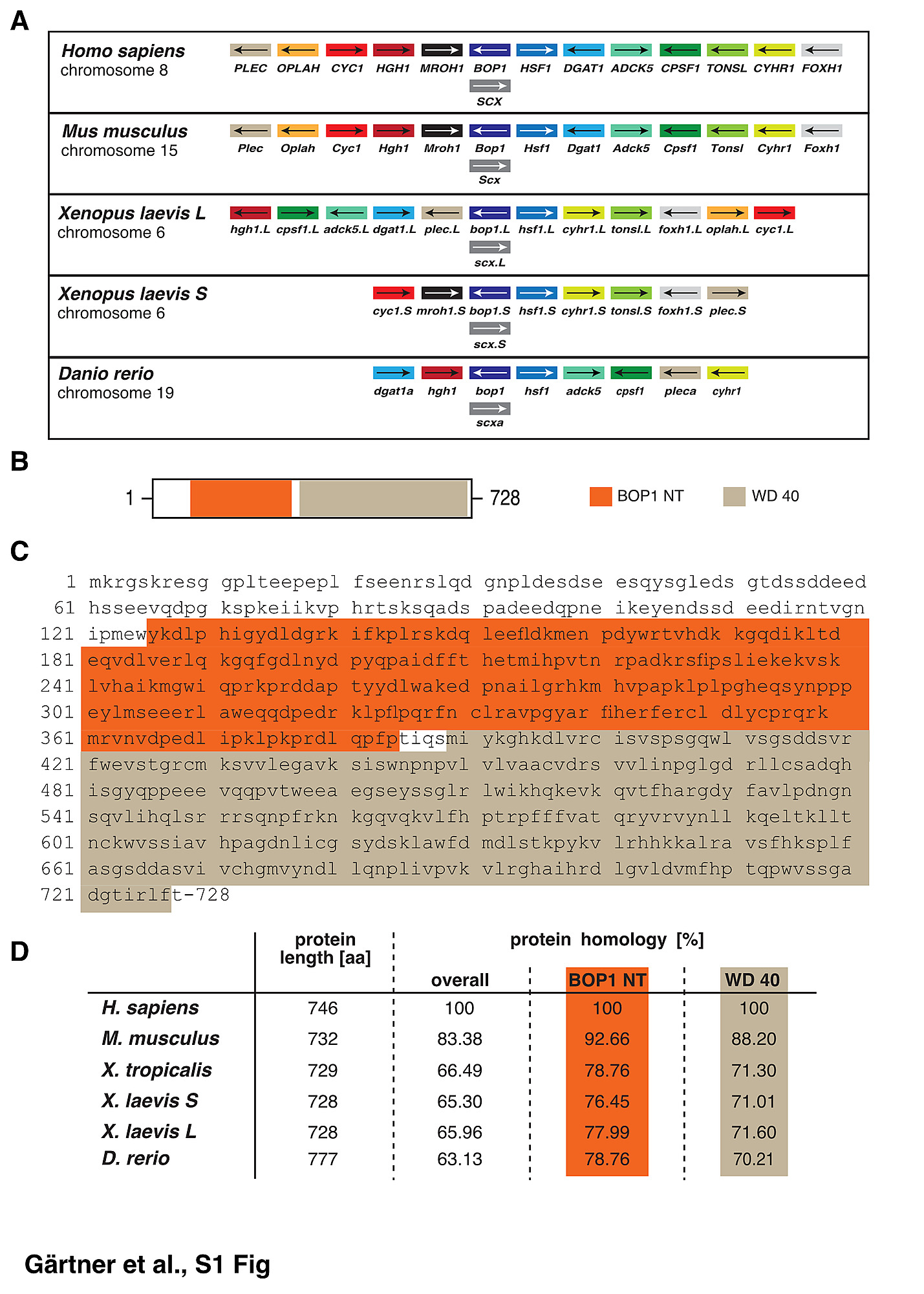 S1 Fig. Synteny analysis and comparison of block of proliferation 1 protein domains between different species. A Synteny analysis of bop1 in Homo sapiens, Mus musculus, Xenopus laevis L, Xenopus laevis S, and Danio rerio. The genomic region next to bop1 is conserved across the different species. B, C Protein domains of block of proliferation 1 (Bop1). The BOP1 N-terminal (NT) domain is depicted in orange and the WD 40 repeat (WD 40) domain, in beige. D The protein length (number of amino acids), the overall homology (%), the Bop1 NT domain homology (%) and the WD40 domain homology (%) of Homo sapiens, Mus musculus, Xenopus laevis L, Xenopus laevis S, and Danio rerio were compared. Bop1 is highly conserved across species. Abbreviations: aa, amino acid; Bop1, block of proliferation 1. |