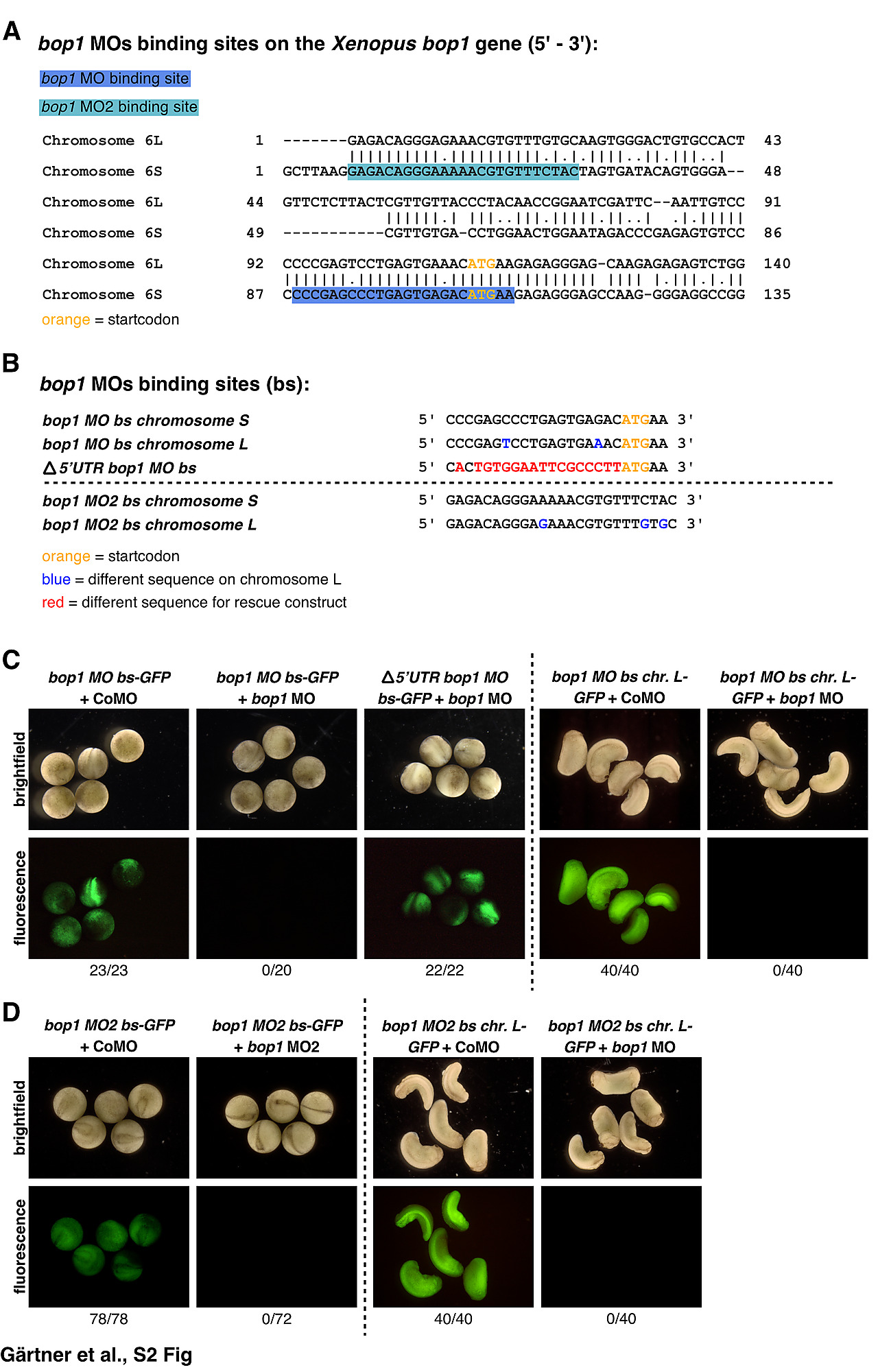 S2 Fig. MO specificity and effectiveness test. A Binding sites of bop1 MO (blue) and bop1 MO2 (turquoise) are highlighted in the Xenopus bop1 gene (L and S- form). The start codon is indicated in orange. B Binding sites of bop1 MO (on both homeologues), bop1 MO2 (on both homeologues), and the Î5âUTR-bop1 construct on Xenopus bop1. Start codon is indicated in orange. Blue letters indicate differences between binding sites of chromosome S and chromosome L. Red letters indicate differences between binding sites of bop1 MO and Î5âUTR-bop1. C Binding specificity test of bop1 MO. Injection of 10 ng Control MO along with 1 ng bop1 MO bs-GFP or 1 ng bop1 MO bs chr. L-GFP led to GFP translation. Co-injection of 10 ng bop1 MO along with 1 ng bop1 MO bs-GFP or with 1 ng bop1 MO bs chr. L-GFP efficiently blocked GFP expression. However, co-injection of Î5âUTR-bop1 MO bs-GFP with bop1 MO led to GFP translation. D Binding specificity test of bop1 MO2. Injection of 10 ng Control MO together with 1 ng bop1 MO2 bs-GFP or with 1 ng bop1 MO2 bs chr. L-GFP resulted in GFP translation. In contrast, injection of bop1 MO2 together with either 1 ng bop1 MO2 bs-GFP or 1 ng bop1 MO2 bs chr. L-GFP blocked GFP translation. Numbers below fluorescence photos describe number of fluorescent embryos. Abbreviations: bop1 MO, block of proliferation 1 morpholino oligonucleotide; bs, binding site; CoMO, Control morpholino oligonucleotide; GFP, green fluorescent protein; UTR, untranslated region. |