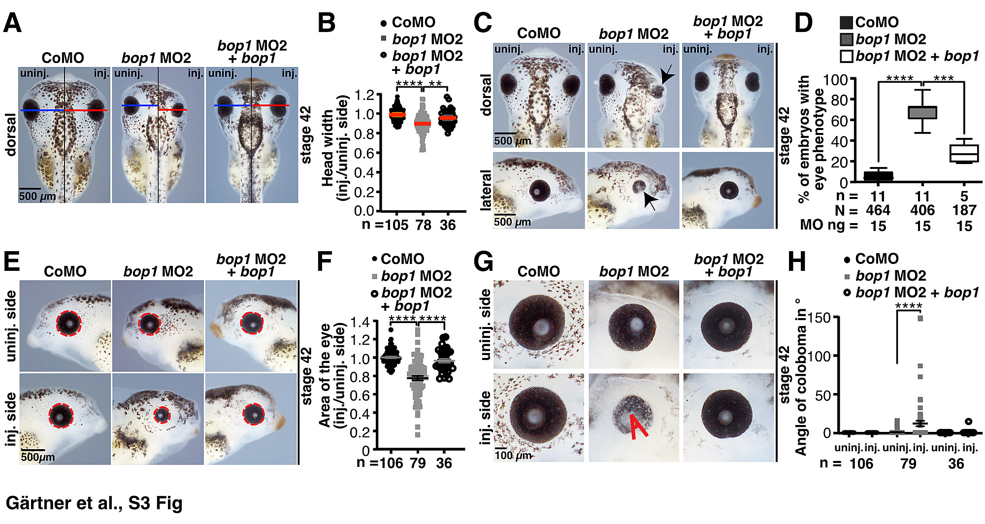 S3 Fig. Eye and head phenotype upon bop1 MO2 injection. A Comparison of the head width of injected (red line) to un-injected (blue line) sides after bop1 MO2, Control MO, or bop1 MO2 together with 0.5 ng of Î5âUTR-bop1 RNA injection at stage 42. B Statistical evaluation of data in A. The head size of the bop1 MO2-injected side was significantly reduced compared to the Control MO-injected and un-injected side. Co-injection of 0.5 ng of Î5âUTR-bop1 RNA rescued the head phenotype. C Knockdown of bop1 by bop1 MO2 led to a severe eye phenotype, with underdeveloped or malformed eyes (black arrows) in stage 42 embryos. This eye phenotype was rescued upon co-injection of 0.5 ng Î5âUTR-bop1 RNA. D Statistical evaluation of data in C. bop1 MO2, bop1 MO2 + Î5âUTR-bop1 RNA and Control MO-injected side was compared to un-injected side of embryos. E The area of the eye was measured (red dotted circle). F Statistical analysis showed significantly smaller eyes in embryos injected with bop1 MO2. The phenotype was rescued in embryos injected with bop1 MO2 together with 0.5 ng Î5âUTR-bop1 RNA. G The angle of eye fissure (red angle) was measured and bop1 MO2, bop1 MO2 + Î5âUTR-bop1 RNA and Control MO-injected embryos were compared to the uninjected side. H Embryos developed colobomas upon bop1 MO2 injection, whereas co-injection of 0.5 ng Î5âUTR-bop1 RNA rescued this coloboma phenotype. Abbreviations: bop1 MO2, block of proliferation 1 morpholino oligonucleotide 2; CoMO, Control MO; inj., injected side; MO, morpholino oligonucleotide; n, number of independent experiments; N, number of injected and analyzed embryos; uninj., un-injected side. bop1 is the Î5âUTR-bop1 RNA used for rescues. Error bars indicate standard error of the means; Whiskers in D indicate minimum and maximum. |
