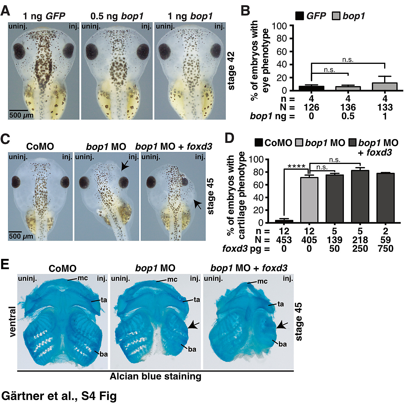 S4 Fig. Overexpressing bop1 does not affect anterior development in Xenopus laevis. bop1 knockdown-associated phenotype is not rescued by co-injecting foxd3 RNA. A Overexpression of bop1 did not result in a phenotype of anterior neural tissue in stage 42 embryos. bop1 RNA and GFP RNA-injected side was compared to un-injected side of embryos. B Statistical evaluation of data given in A. C Co-injection of bop1 MO and foxd3 RNA did not rescue the cranial cartilage phenotype. bop1 MO, Control MO, and bop1 MO + foxd3 RNA-injected side was compared to un-injected side of stage 45 embryos. Black arrows indicate a smaller cranial cartilage. D Statistical evaluation of data in C. E Alcian blue stained cranial cartilages of stage 45 embryos showed a reduced cartilage upon bop1 MO and bop1 MO + foxd3 RNA injection. Branchial arches (ba), Meckel´s cartilage (mc), tectum anterius (ta) were mostly affected (black arrows). Abbreviations: ba, branchial arches; bop1 MO, block of proliferation 1 morpholino oligonucleotide; CoMO, Control MO; GFP, green fluorescent protein; inj., injected side; mc, Meckel´s cartilage; MO, morpholino oligonucleotide; n, number of independent experiments; N, number of injected and analyzed embryos; n.s., non-significant; ta, tectum anterius; uninj., un-injected side. Error bars indicate standard error of the means; |