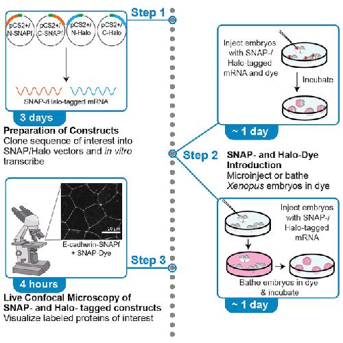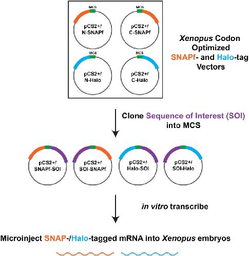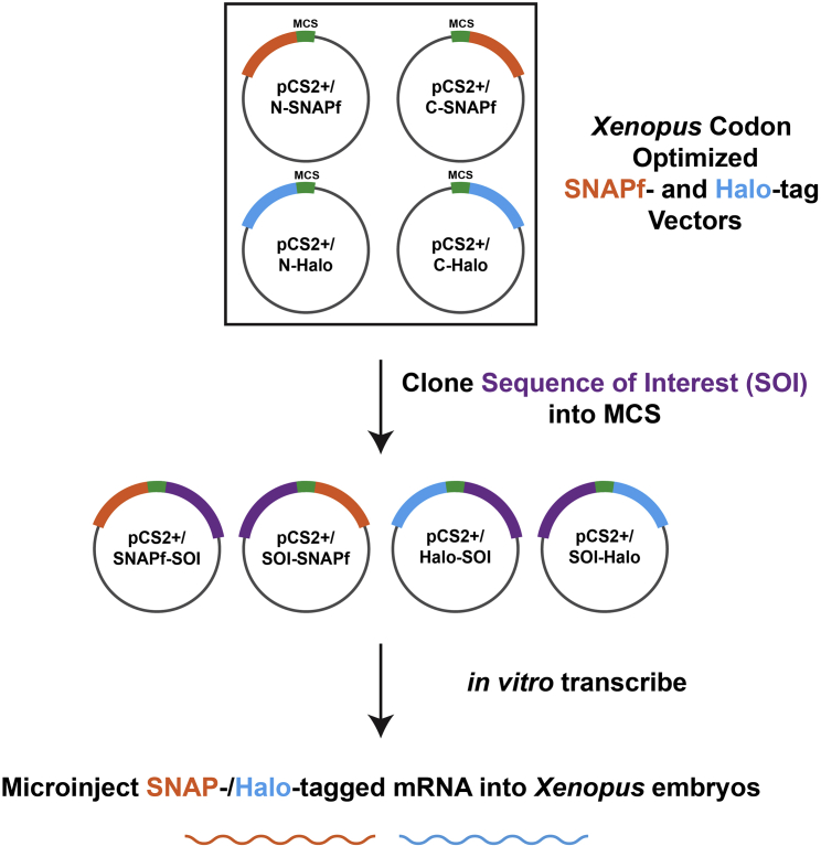 Figure 1. Workflow for expression of pCS2+/SNAPf- and Halo-tagged constructs in Xenopus embryospCS2+/SNAPf- and Halo-vectors that were codon optimized for Xenopus can be acquired from Addgene. The sequence of interest is cloned into the multiple cloning site (MCS), located upstream/downstream of the SNAPf/Halo-tag. Tagged constructs are in vitro transcribed to generate mRNA that is microinjected into 2–4 cell stage Xenopus embryos.