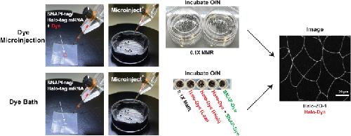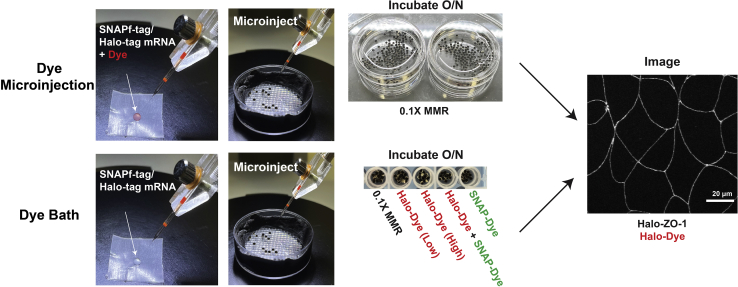 Figure 2. Dye introduction methods for labeling SNAPf- or Halo-tagged proteins expressed in intact Xenopus embryos(Top) SNAP/Halo dyes can be microinjected with SNAPf- or Halo-tagged mRNAs. (Bottom) After microinjecting SNAPf- or Halo-tagged mRNAs, embryos can also be bathed in SNAP/Halo dyes overnight (O/N, 15–22 h) for next-day imaging.