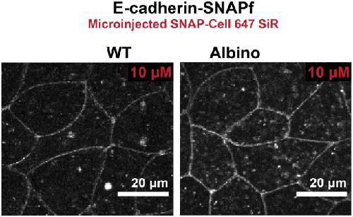 Figure 3. SNAP-tagged proteins can be visualized in both wild type (WT) and albino gastrula-stage Xenopus laevis embryosImages of WT (left) and Albino (right) Xenopus laevis embryos co-microinjected with E-cadherin-SNAPf mRNA (50 pg) and SNAP-Cell 647 SiR dye (10 μM). Scale Bars: 20 μm.