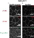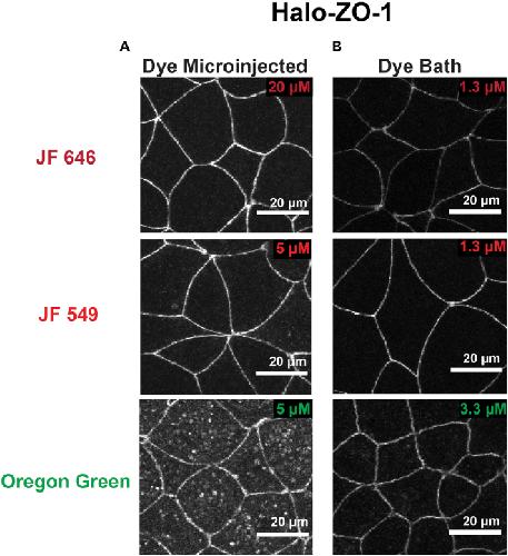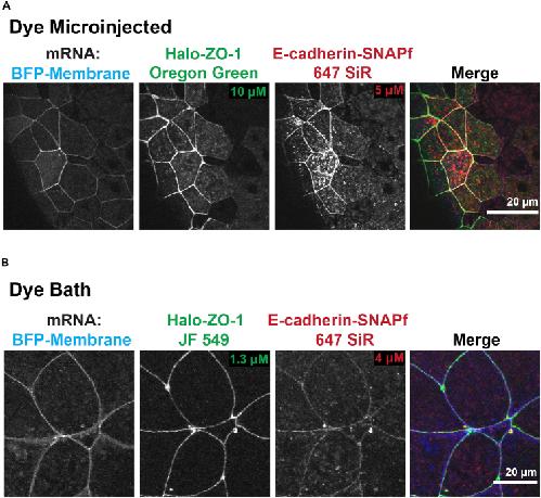 Figure 5. Microinjecting or bathing embryos in dye can label Halo-ZO-1 in vivo(A) Images of Xenopus embryos expressing Halo-ZO-1 (100 pg) labeled via dye microinjection with Janelia Fluor 646 HaloTag (20 μM), Janelia Fluor 549 HaloTag (5 μM), or Oregon Green HaloTag (5 μM).(B) Images of Xenopus embryos expressing Halo-ZO-1 (100 pg) labeled via dye bath with Janelia Fluor 646 HaloTag (1.3 μM), Janelia Fluor 549 HaloTag (1.3 μM), and Oregon Green HaloTag (3.3 μM).Scale Bars: 20 μm.