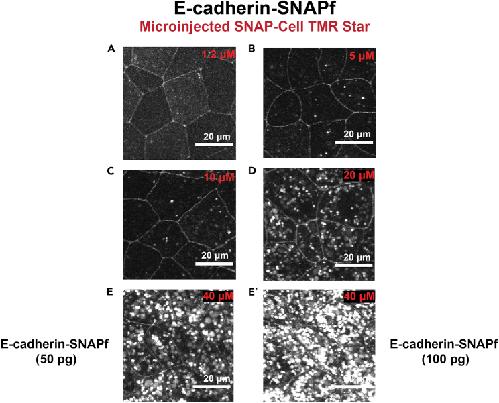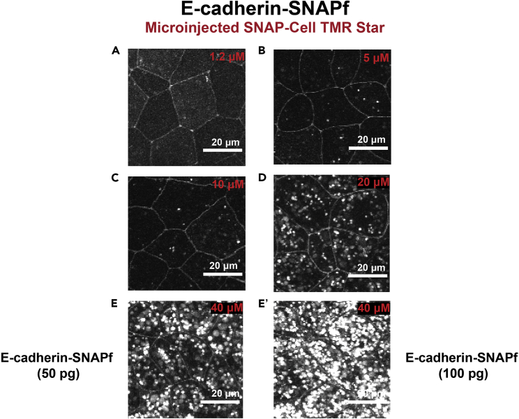 Figure 9. Dye and mRNA concentration optimization is necessary to reduce non-specific signal(A–E) Images of E-cadherin-SNAPf (50 pg) labeled with SNAP-Cell TMR Star ((A) 1.2 μM, (B) 5 μM, (C) 10 μM, (D) 20 μM, (E) 40 μM) through dye microinjections.(E′) E-cadherin-SNAPf (100 pg) labeled with 40 μM SNAP-Cell TMR Star.Scale Bars: 20 μm.