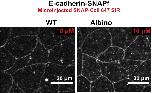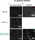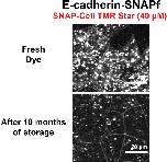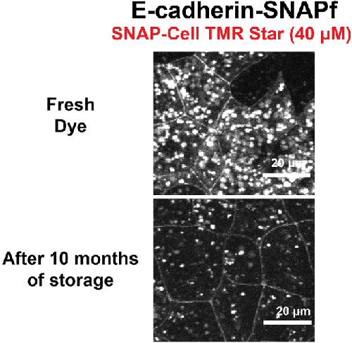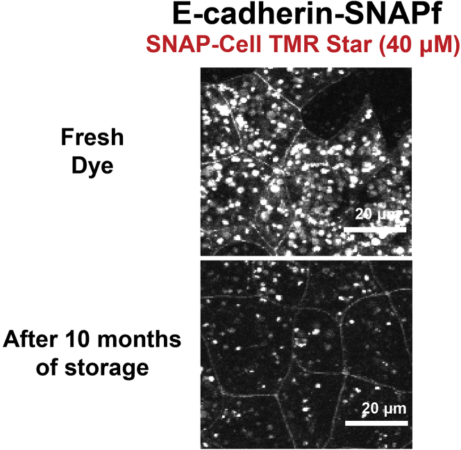 Figure 10. Non-desiccated SNAP-Cell TMR-Star dye aliquots can lose brightness following long-term storageE-cadherin-SNAPf (50 pg) labeled with SNAP-Cell TMR Star (40 M) (newly acquired, top) (long term storage, bottom). Scale Bars: 20 μm.