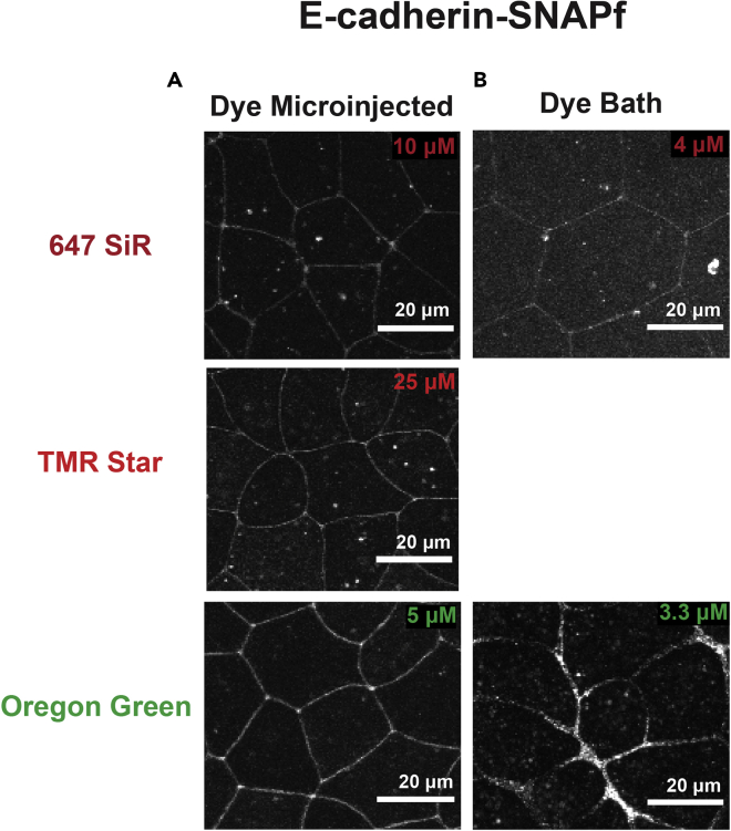 Figure 4. Microinjecting or bathing embryos in dye can label E-cadherin-SNAPf in vivo(A) Images of Xenopus embryos expressing E-cadherin-SNAPf (50 pg) labeled via dye microinjection with SNAP-Cell 647 SiR (10 μM), SNAP-Cell TMR Star (25 μM), or SNAP-Cell Oregon Green (5 μM).(B) Images of Xenopus embryos expressing E-cadherin-SNAPf (50 pg) labeled via dye bath with SNAP-Cell 647 SiR (4 μM) or SNAP-Cell Oregon Green (3.3 μM).Scale Bars: 20 μm.
