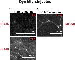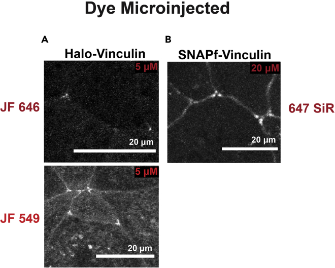 Figure 6. Microinjecting dye can label SNAPf-/Halo-Vinculin in vivo(A) Images of Xenopus embryos expressing Halo-Vinculin (10 pg) labeled via dye microinjection with Janelia Fluor 646 HaloTag (5 μM) and Janelia Fluor 549 HaloTag (5 μM).(B) Image of Xenopus embryo expressing SNAPf-Vinculin (10 pg) labeled via dye microinjection with SNAP-Cell 647 SiR (20 μM).Scale Bars: 20 μm.