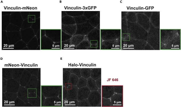 Figure 7. Halo-tag improves the visualization of difficult to image proteins compared with traditional fluorescent tags(A–E) Images of Xenopus embryos expressing (A) Vinculin-mNeon (10 pg), (B) Vinculin-3XGFP (30 pg), (C) Vinculin-GFP (10 pg), (D) mNeon-Vinculin (10 pg), and (E) Halo-Vinculin (10 pg) labeled with microinjected Janelia Fluor 646 HaloTag (5 μM).Scale Bars: 20 μm and 5 μm.