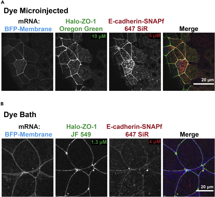 Figure 8. SNAP- and Halo-tagged proteins can be visualized simultaneously, through dye microinjections or dye baths, in gastrula-stage Xenopus laevis embryos(A) Xenopus laevis gastrula-stage embryos expressing BFP-membrane (15 pg) (blue), Halo-ZO-1 (100 pg) labeled with microinjected Oregon Green HaloTag (10 μM) (green), and E-cadherin-SNAPf (50 pg) labeled with microinjected SNAP-Cell 647 SiR (5 μM) (red).(B) Xenopus laevis gastrula-stage embryos expressing BFP-membrane (15 pg) (blue), Halo-ZO-1 (100 pg) labeled via dye bath with Janelia Fluor 549 HaloTag (1.3 μM) (green), and E-cadherin-SNAPf (50 pg) labeled via dye bath with SNAP-Cell 647 SiR (4 μM) (red).Scale Bars: 20 μm.