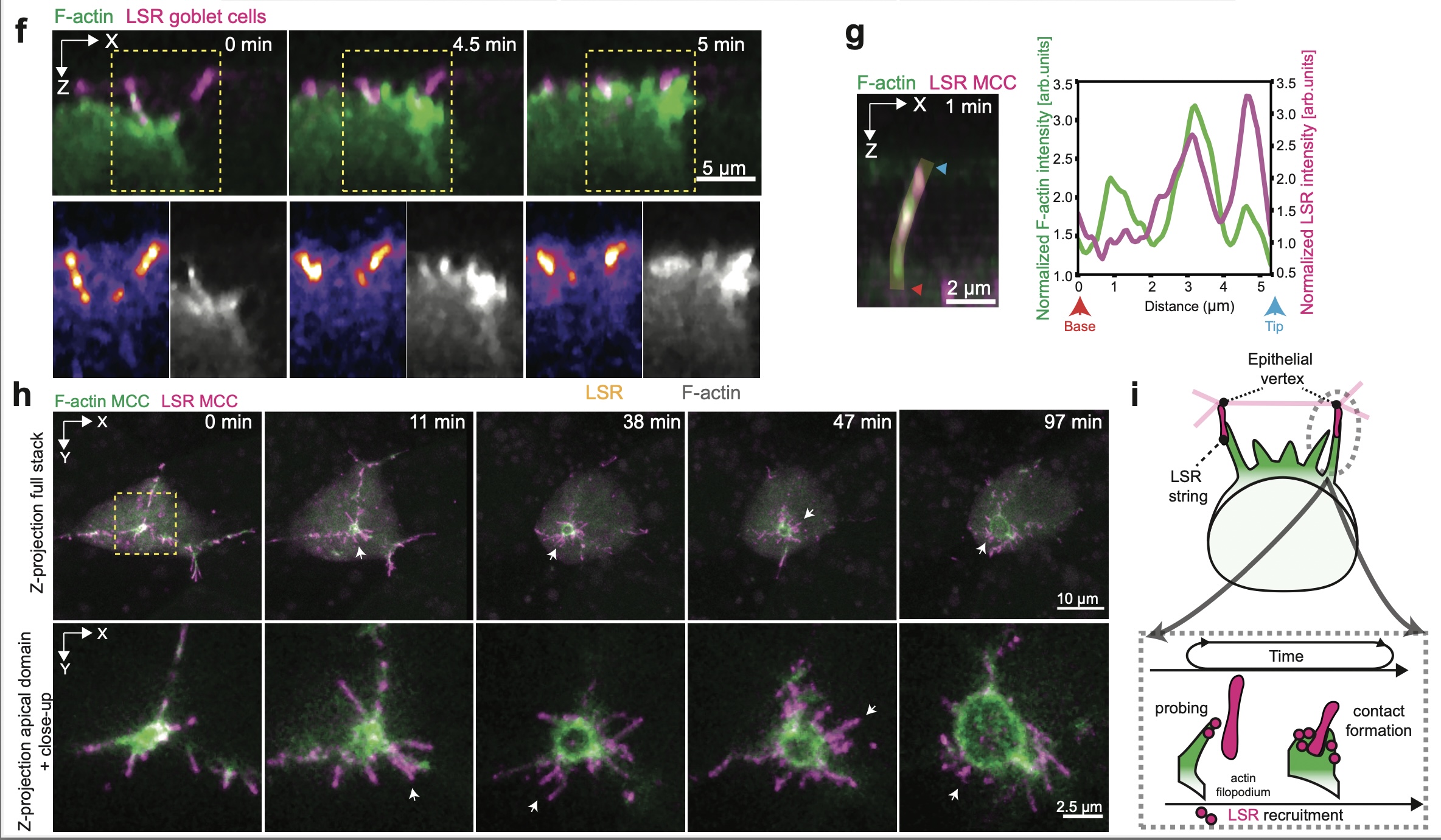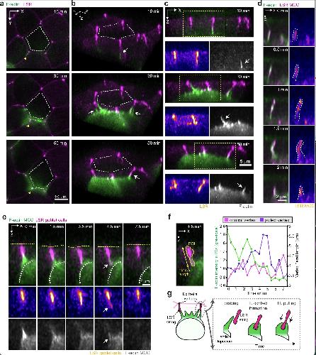 Supplementary Fig. 2 Filopodia interact directly with epithelial vertices. [continued] f, Orthogonal (XZ) projections of integrating MCC expressing α-tubulin::LifeAct-RFP interacting with vertices labeled by LSR-GFP (pseudo-colored in magenta) under nectin promoter expression. Insets depict F-actin recruitment in the MCC to stabilize the new contact. Scale bar: 5 μm. g, Plot profile of F-actin and LSR along filopodium from Fig. 2d. Normalized fluorescence intensity values for F-actin and LSR are plotted from the base to the tip of filopodium. Scale bar: 2.5 μm. h, Image sequence of LSR-overexpressing MCC. The apically expanding MCC expresses α-tubulin::LifeAct-RFP (pseudo-colored in green), and α-tubulin::LSR-RFP (pseudo-colored in magenta). Ectopic protrusions are marked with white arrows. Top row: Full projection. The yellow box marks inset for the bottom row, with a close-up on the apical domain. i, Schematics representing LSR recruitment to the leading edge of integrating MCC.