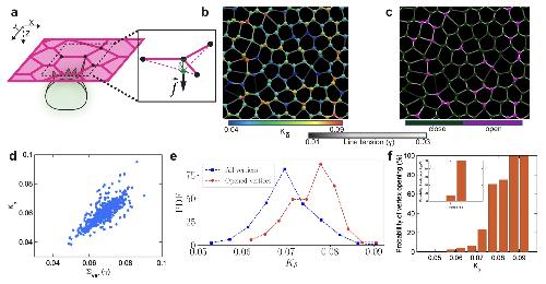 a Schematics represent the out-of-plane force (f) exerted by an integrating MCC on an epithelial vertex inducing an out-of-plane displacement (δ). b Representative snapshot of the simulated cellular network. The colormap on junctions indicates line tension (γ), while the vertices are color-coded according to their stiffness (Kδ). c Representative snapshot of the cellular network illustrating propensity of vertices to open upon cell integration. Purple (dark green) vertices mark vertices with successful (failed) insertions. d Vertex stiffness increases with the increasing sum of line tensions at each vertex. e The probability density function (PDF) of the vertex stiffness distributions for all vertices in the simulated cellular network (blue) and the vertices with successful integration events were (red). f The probability of vertex opening for varying vertex stiffness values. The inset shows the opening probability for threefold vs. fourfold vertices.