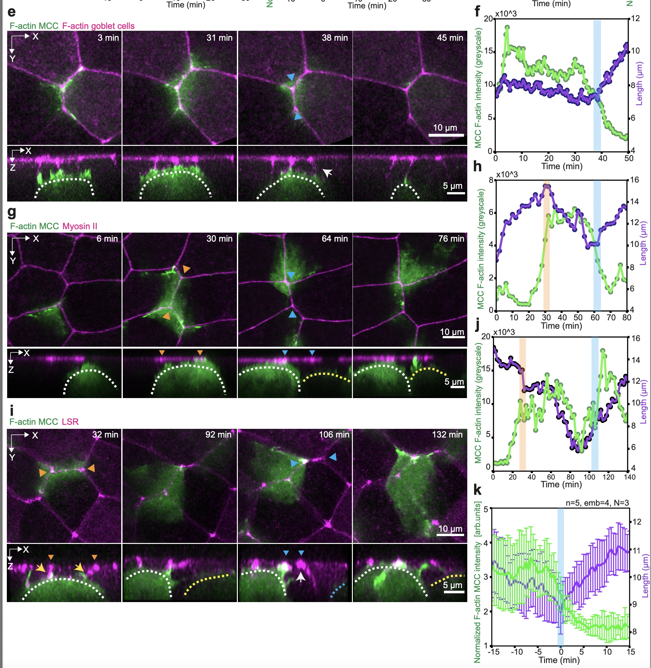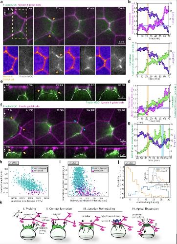 e,g,i, Image sequence depicting epithelial junction retraction after MCC (pseudo colored in green) loses contact (marked by cyan arrowheads) with the vertex. Junctions are labeled with nectin Utrophin-RFP in e, SF9-3xGFP in g and LSR-3xGFP in i. White dotted line marks the cell of interest, the yellow dotted line marks the competing MCC. The yellow and white arrows mark contact formation and loss with the vertex, respectively. f,h,j, Corresponding MCC F-actin intensity in grey values (green) and junction length (purple) during junction retraction. k, Average normalized MCC F-actin intensity (green) and junction length (purple) before and after retraction (marked by t=0)(n=5 junctions from 4 embryos, N=3 experiments). b-d, k, data show mean ± SEM.