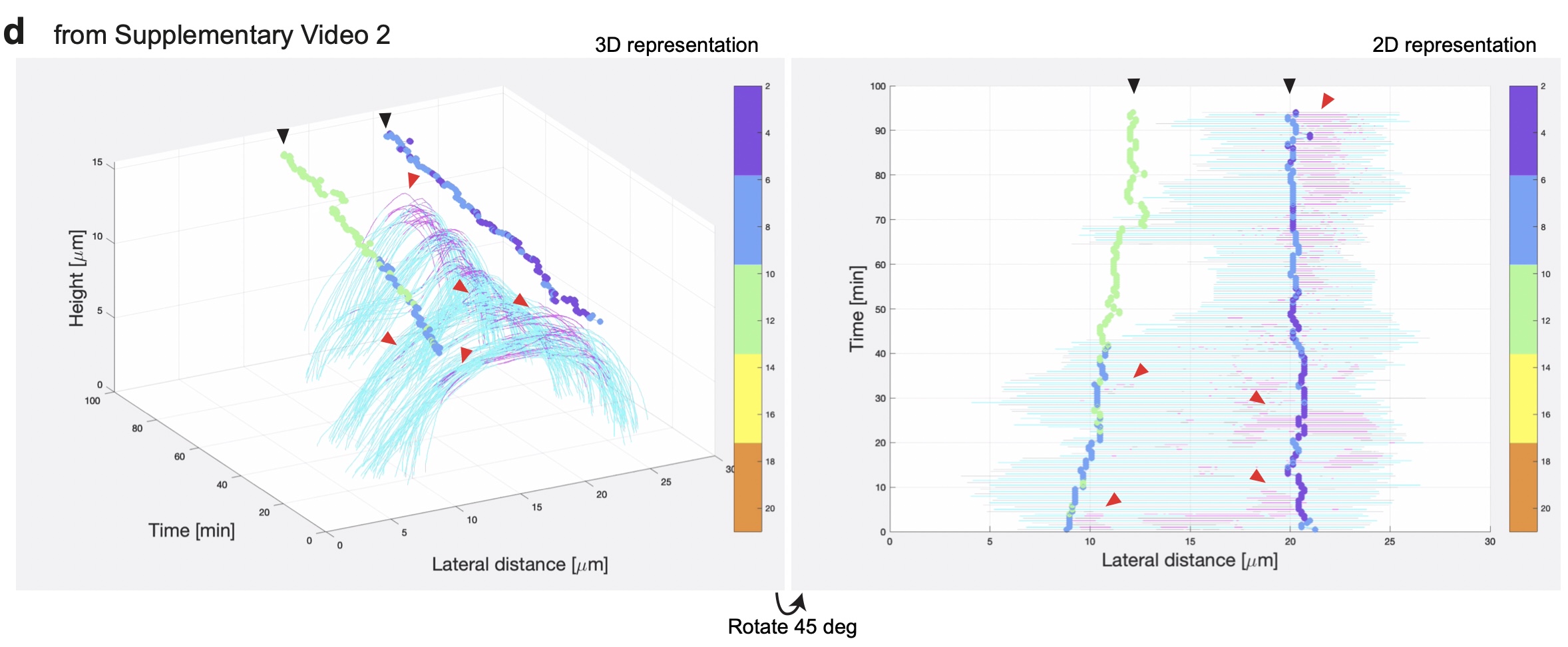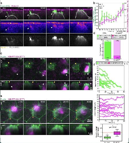 Supplementary Fig. 1 Filopodia dynamics during the probing phase of MCC integration. [continued] d, Representation of different modes of visualization of filopodia activity (stills adapted from Supplementary Video 2). F-actin filopodia extended by a single MCC are labeled in magenta while the MCC leading-edge is labeled in cyan. The overlying vertices are represented by the vertical tracks marked by black arrowheads, color-coded for the distance between the MCC tip and the left or right vertex during the probing phase. Lateral distance in μm describes the distance migrated in XY, whereas Height in μm describes the distance migrated in the axial direction. Red arrowheads mark filopodia-vertex interactions.