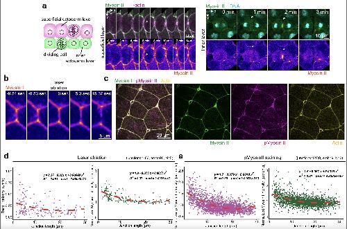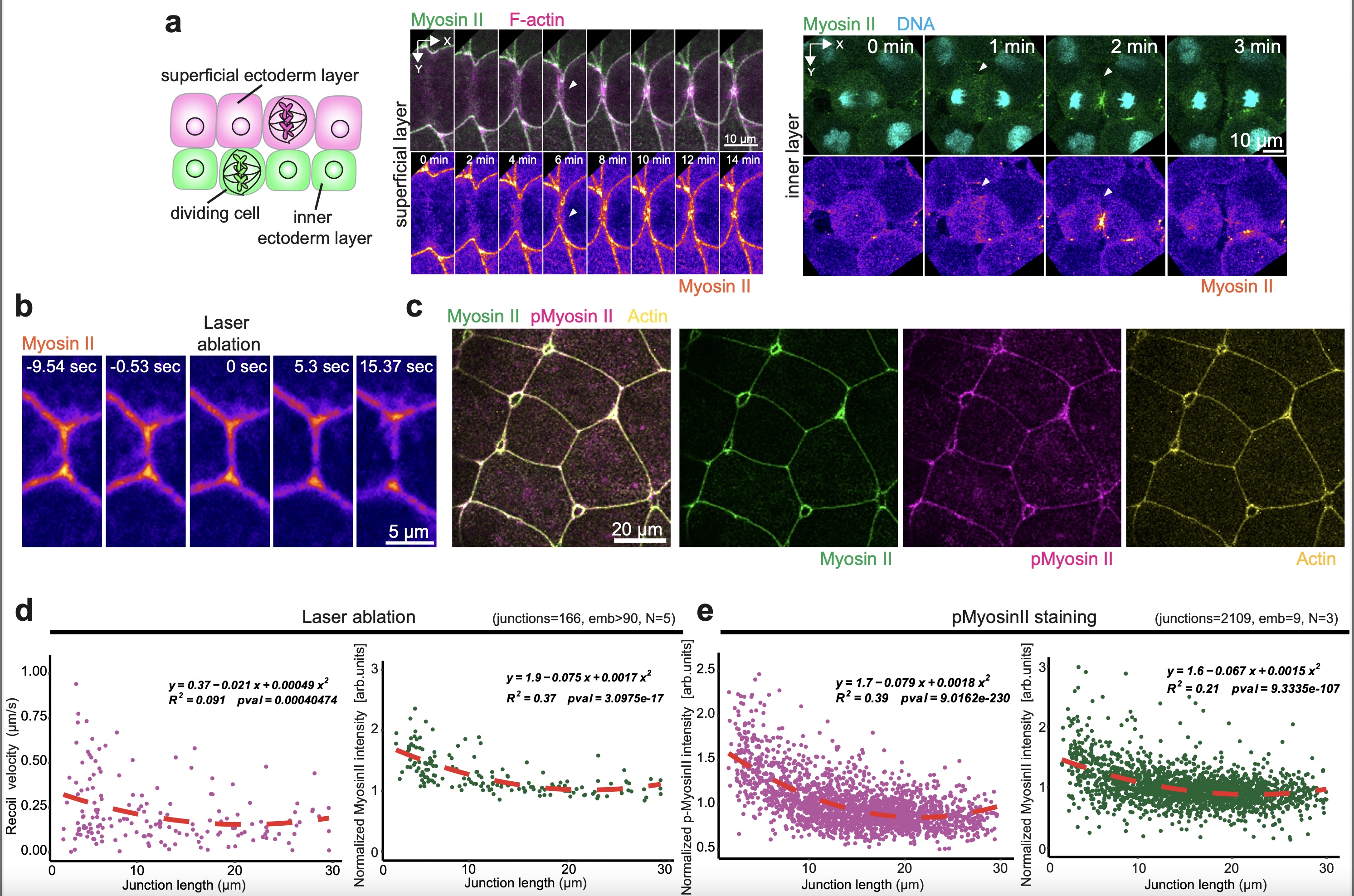 Supplementary Fig. 5: Validation of myosin II sensor and vertex model predictions. a-e, The SF9-3xGFP myosin II sensor serves as a proxy for junctional tension. a, The SF9-3xGFP sensor (myosin II) localizes to the cleavage furrow of superficial (left panel) and inner (right panel) dividing ectodermal cells. b, Laser ablation of superficial epithelial cell junctions. Myosin II is pseudo-colored in fire. c, Phosphomyosin-II staining of superficial epithelium expressing the SF9-3xGFP myosin II sensor. SF9-3xGFP myosin II sensor (myosin II) is pseudo-coloured in green, active phosphorylated myosin (pmyosin II) is pseudo-coloured in magenta and F-actin is pseudo-coloured in yellow. d, Analysis of laser ablation data. For recoil data: equation (y=0.37-0.021x+0.0004074x^2), goodness of fit (R2=0.091) and two-sided F-test p-value (0.0004074). For myosin II: equation (y=1.9-0.075x+0.0017x^2), goodness of fit (R2=0.37) and two-sided F-test p-value (3.0975e-17) (junctions=166 from >90 embryos, N=5 experiments). e, Analysis of phosphomyosin II (pmyosin II) and SF9-3xGFP (myosin II) staining data. For pmyosinII data: equation (y=1.7-0.079x+0.0018x^2) , goodness of fit (R2=0.39) and F-test p-value (9.0162e-203). For myosin II: equation (y=1.6-0.067x+0.0015x^2) , goodness of fit (R2=0.21) and F-test p-value (9.3335e-107) (junctions=2109 from 9 embryos, N=3 experiments).