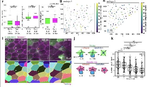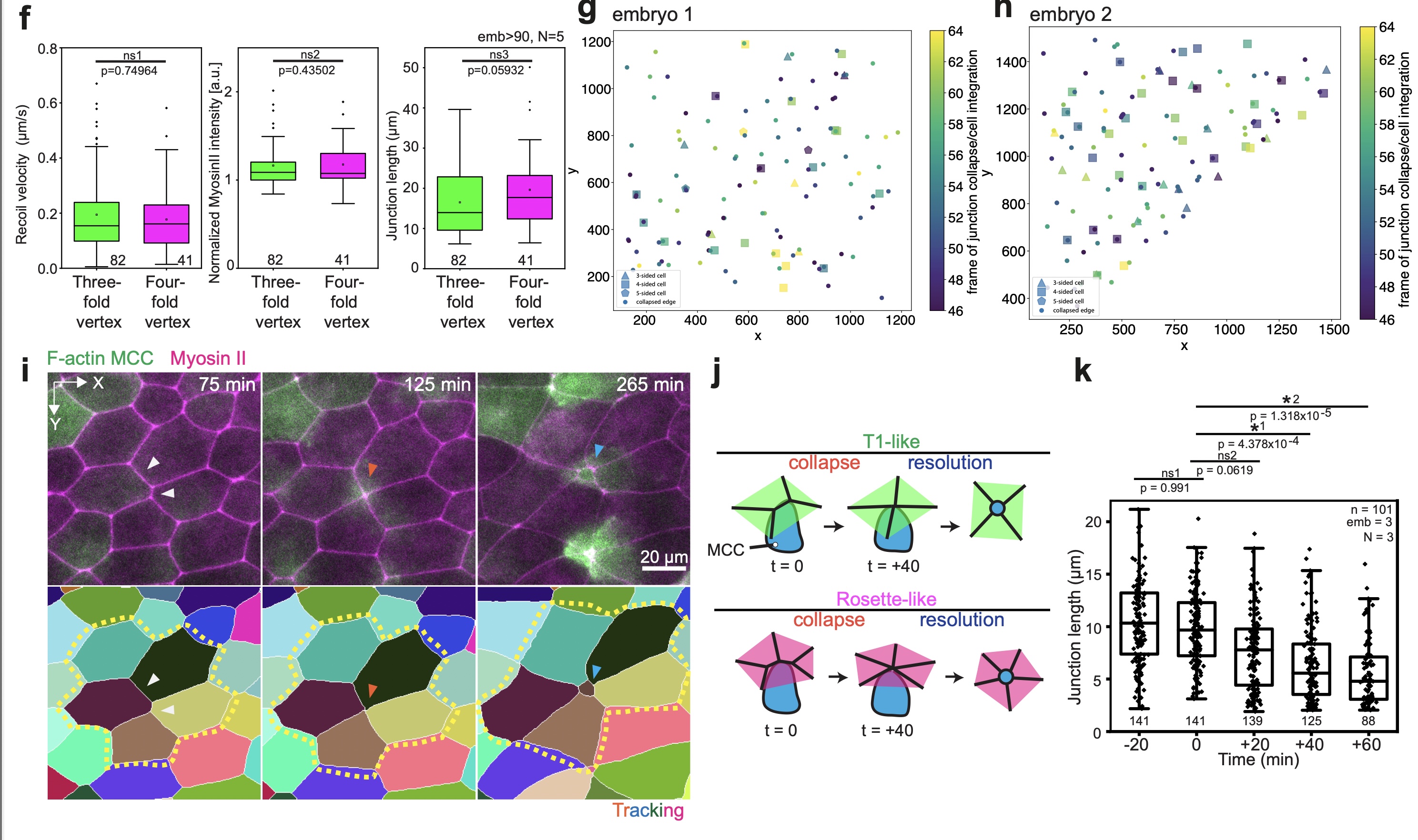 Supplementary Fig. 5: Validation of myosin II sensor and vertex model predictions. [continued]f, Comparison of recoil velocities, myosin II intensities and length between junctions connected to either three-fold vertex or four-fold vertex (82 three-fold vertices and 41 four-fold vertices from >90 embryos, N=5 experiments). Boxes extend from the 25th to 75th percentiles, with a line at the median and whiskers representing range within 1.5 interquartile range. Two-tailed Mann-Whitney test with 0.05 significance level. ns1 p=0.74964, ns2 p=0.43502, ns3 p=0.05932. g-h, Spatial correlation between epithelial junction collapse (circles) and MCC integration (polygons), colored by the time of occurrence for two different embryos. i, Example of a higher-fold MCC integration. Top panel, snapshots of MCC integrating in a higher-order vertex. MCC is labeled with α-tubulin::LifeAct-RFP (pseudo-colored in green) and the myosin intrabody with SF9-3xGFP (pseudo-colored in magenta). Bottom panel, Segmented image. White arrowhead mark initial epithelial junction layout, orange arrowhead mark junction collapse and cyan arrowhead marks apical expansion. The yellow outline depicts the formation of a rosette-like structure. Scale bar: 20 μm. j, Schematics of cell integration at higher-fold vertices, which is divided in a remodeling phase and a resolution phase. Integration at a 4-fold vertex resembles a T1 event (T1-like) whereas 5-fold integration or higher resembles the formation of a rosette (Rosette-like). k, Epithelial junction length distribution involved in formation of higher-order vertices. T=0 marks the onset of MCC reaching the overlying junction (number of junctions is specified for each timepoint, n=101 cells from 3 embryos, N=3 experiments). Boxes extend from the 25th to 75th percentiles, with a line at the median and whiskers representing range within 1.5 interquartile range. One-way Analysis of Variances (ANOVA) with Tukey’s test and a significance level of 0.05 was used to compare difference junction lengths with the reference junction length (junction length at the onset of MCC integration, T=0). ns1 p=0.991, ns2 p=0.0619, *1 p= 4.378E-4, *2 p=1.318E-5.