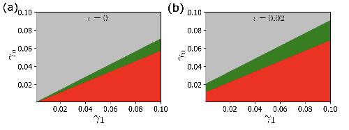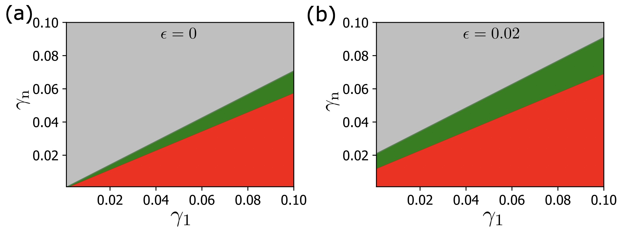 Supplementary Figure 13. Stability diagram for the intercalation at 3-fold and 4-fold vertices. Gray: neither three-fold nor four-fold allows a cell intercalation. Green: Only four-fold vertices allow cell intercalation. Red: Both three-fold and four-fold vertices allow for cell intercalation. The diagram is given for both Infinitesimal size (a) and finite size of inserting cells (b). (see Supplementary Note 1)