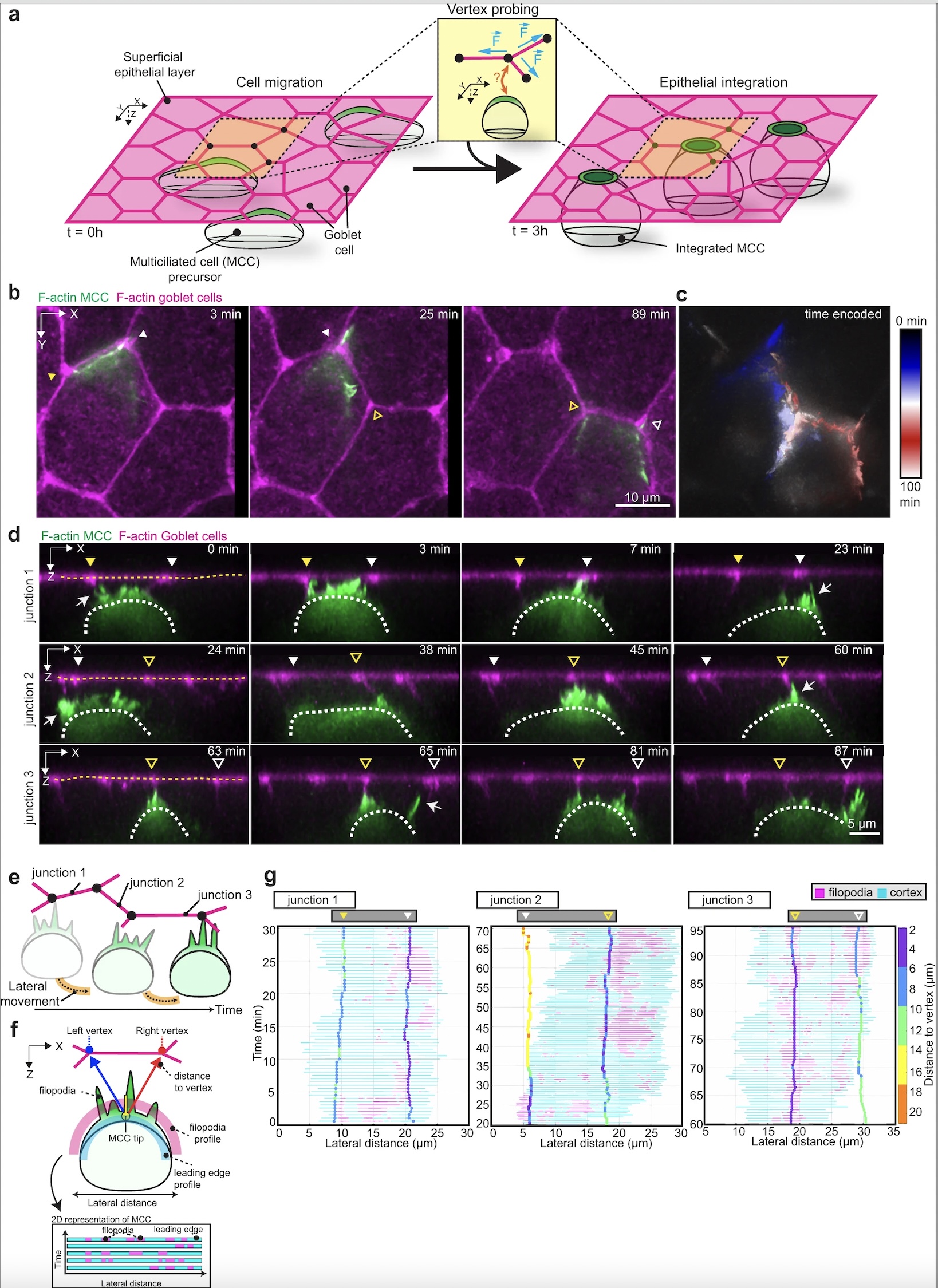 a Schematics representing multiciliated cell (MCC) integration into the superficial epithelium. MCCs (in green) migrate into the superficial epithelium (t = 0 h) to integrate at the epithelial vertices formed by the neighboring goblet cells (in magenta) (t = 3 h). Inset depicts vertex probing by a single MCC. Epithelial vertices (black dots) form hotspots of mechanical tension as connecting junctions (magenta) pull on the vertex (blue arrows). b–g Dynamics of vertex probing by MCCs. MCC expresses α-tubulin::LifeAct-GFP (pseudo-colored in green) while goblet cells express nectin::utrophin-RFP (pseudo-colored in magenta). Yellow and white arrowheads, with and without fill, mark the position of different vertices and white arrows point to filopodia. b Image sequence from XY projection of MCC moving in between the overlying goblet cells. Scale bar: 10 μm. c Temporal-color-coded XY projection of MCC in b. d Orthogonal (XZ) projections of MCC in b used for filopodia dynamics analysis. White dotted lines outline the MCC contour and yellow dotted lines outline the top of the superficial epithelium. Arrowheads mark the position of the epithelial vertices. Scale bar: 5 μm. e Schematics representing the lateral movement of integrating MCCs. f Schematic representation of the main components of the filopodia analysis pipeline (see “Methods”). g Filopodia analysis of integrating MCC from d. The relative position of F-actin protrusions (filopodia, magenta) extended by a single MCC from its leading-edge (cyan, each line representing an individual time point) and the overlying epithelial vertices (vertical tracks, color-coded for the distance to vertex (between the MCC tip and the left or right vertex)) during MCC lateral movement. Arrowheads mark the position of the epithelial vertices as in d.