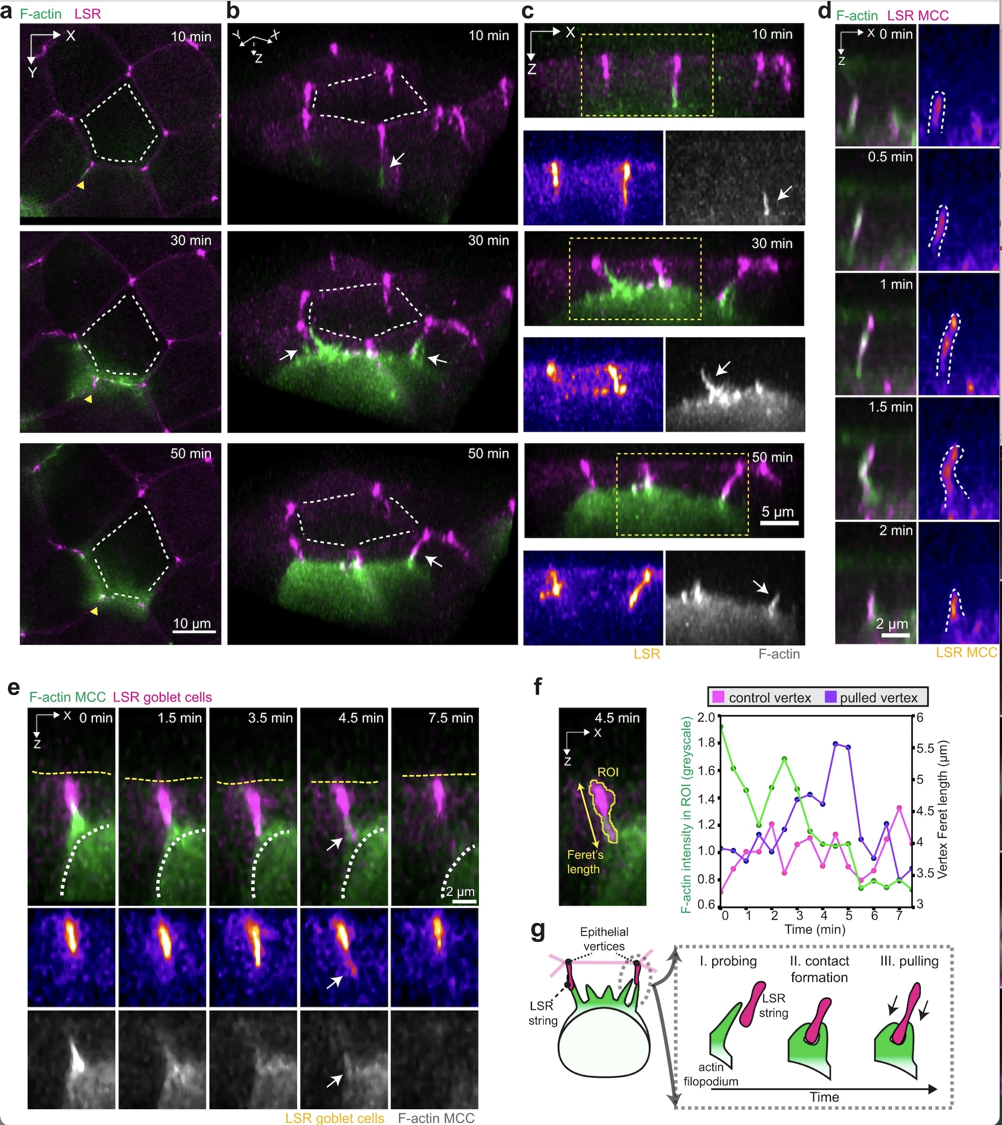 a–d Filopodia interact with epithelial vertices as MCC moves into the superficial epithelium. The actin cortex of MCCs is labeled with α-tubulin::LifeAct-RFP (pseudo-colored in green in composite images and gray as a separate channel). a Image sequence of integrating MCC interacting with overlying vertices. Epithelial vertices are labeled with lipolysis stimulated lipoprotein receptor tagged with x3GFP (LSR, pseudo-colored in magenta in composite images and fire as a separate channel). Scale bar: 10 μm. White dotted lines outline overlying junctions. The yellow arrowheads depict the orientation used for 3D rendering in b. b 3D rendering of a, with MCC forming contacts with different vertices (marked by white arrows). White lines outline overlying junctions. c Orthogonal (XZ) projections of a, depicting the attachment between filopodia (marked by white arrows) and vertices. Yellow boxes mark insets for separate channels. Scale bar: 5 μm. d Close-up of LSR-GFP (pseudo-colored in magenta in composite and fire as a separate channel) localization within a growing and retracting filopodium, visualized by F-actin marker (LifeAct, pseudo-colored in green). LSR is visualized by expressing α-tubulin::LSR-GFP. Scale bar: 2 μm. e Orthogonal (XZ) projections of filopodium pulling on the epithelial vertex (marked by white arrows). The epithelial vertex is marked by expressing nectin::LSR-GFP. The white dotted line outlines the MCC contour and the yellow dotted line outlines the apical surface of the superficial epithelium. Scale bar: 2 μm. f Quantification of vertex pulling from e. The MCC F-actin intensity (green) and vertex length during one event of vertex pulling (purple) and for a non-pulled vertex (magenta). g Schematics representing MCC probing and vertex pulling.