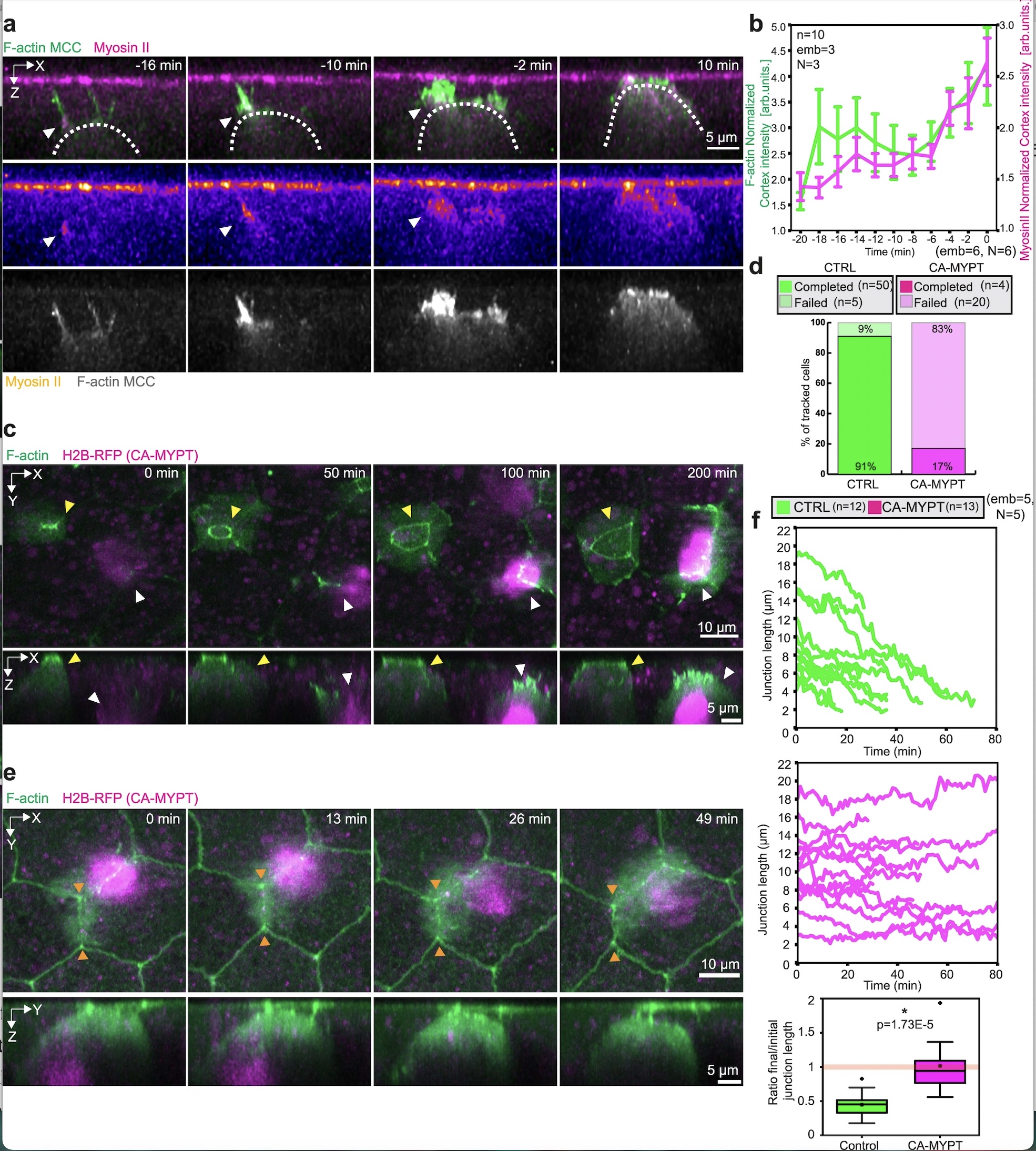 a Orthogonal (XZ) projections of myosin II recruitment to the MCC leading edge during integration. MCC is labeled with α-tubulin::LifeAct-GFP (pseudo-colored in green in the composite image, pseudo-colored in gray as a separate channel) and myosin-II is labeled with the myosin intrabody SF9-3xGFP (pseudo-colored in magenta in the composite image, fire pseudo-colored as a separate channel). White arrowheads depict myosin recruitment. Scale bar: 5 μm. b Normalized myosin-II intensity (magenta) and normalized F-actin intensity (green) at the cortex of integrating MCCs. T = 0 marks the last tracked frame during integration (n = 10 cells from 3 embryos, N = 3 experiments). Data show mean ± SEM. c Image sequence of control MCC (yellow arrowhead) and CA-MYPT-overexpressing MCC (white arrowhead, marked with H2B-RFP pseudo-colored in magenta) during integration. Control and CA-MYPT overexpressing MCC express LifeAct-GFP mRNA (pseudo-colored in green). Scale bar: 10 μm. d Quantification of MCC integration success rates for control and CA-MYPT overexpressing cells (nWT = 55 cells, nCA-MYPT = 24 cells from 5 embryos, N = 5 experiments). e Image sequence of a CAMYPT-overexpressing MCC attempting epithelial junction remodeling (orange arrowheads). Goblet cells and CA-MYPT overexpressing MCC express LifeAct-GFP mRNA (pseudo-colored in green). Scale bar: 5 μm. f Junction length tracking for control (green) and CA-MYPT-overexpressing MCCs (magenta) (nWT = 12 junctions, nCAMYPT = 13 junctions from 5 embryos, N = 5 experiments). Boxplots of final to initial junction length ratio in control and CA-MYPT MCCs. The orange line indicates no overall junctional remodeling (final to initial junction length ratio = 1). Boxes extend from the 25th to 75th percentiles, with a line at the median and whiskers representing range within 1.5 interquartile range. Two-tailed Mann–Whitney test with 0.05 significance level *p = 1.73E−5.