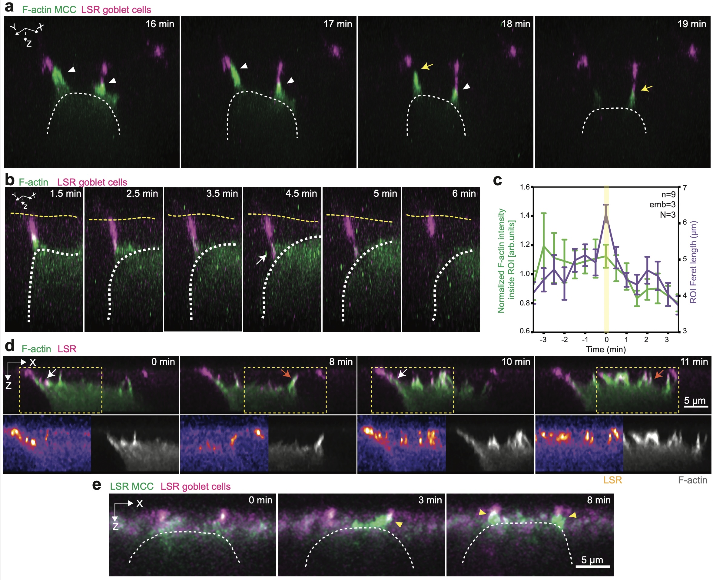 Supplementary Fig. 2 Filopodia interact directly with epithelial vertices. a, 3D rendering of integrating MCC during the probing phase. The MCC (expressing α-tubulin::LifeAct-RFP, pseudo-colored in green) uses filopodia to attach to the vertices of epithelial goblet cells (expressing nectin::LSR-RFP, pseudo-colored in magenta). White arrowheads depict filopodia-vertex contact and yellow arrows depict contact retraction. b, 3D rendering from Fig. 2e of filopodium pulling on vertex (marked by white arrow). White dotted line outlines the cortex of integrating MCC and the yellow dotted line outlines the top of the superficial epithelium. c, Epithelial vertex-pulling quantification. Average MCC F-actin intensity (green) and vertex length (purple) during pulling and retraction. T=0 marks the vertex length maxima. Data show mean ± SEM (n=9 pulling events from 3 embryos from N=3 experiments). d, Orthogonal (XZ) projections of integrating MCC (expressing α-tubulin::LifeAct-RFP, pseudo-colored in green) expressing LSR-3xGFP (pseudo-colored in magenta). LSR-3xGFP is recruited to the contact points between the MCC and the vertex (white arrows, t=0 min and t= 10 min) and to filopodia (orange arrows, t=8 min and t=11 min). Yellow boxes mark insets with separate channels. Scale bar: 5 μm. e, Orthogonal (XZ) projections of integrating MCC expressing α-tubulin::LSR-GFP (pseudo-colored in green) interacting with vertices labeled with LSR-RFP expressed under nectin promoter (pseudo-colored in magenta). Yellow arrowheads mark LSR-LSR co-localization. Scale bar: 5 μm.