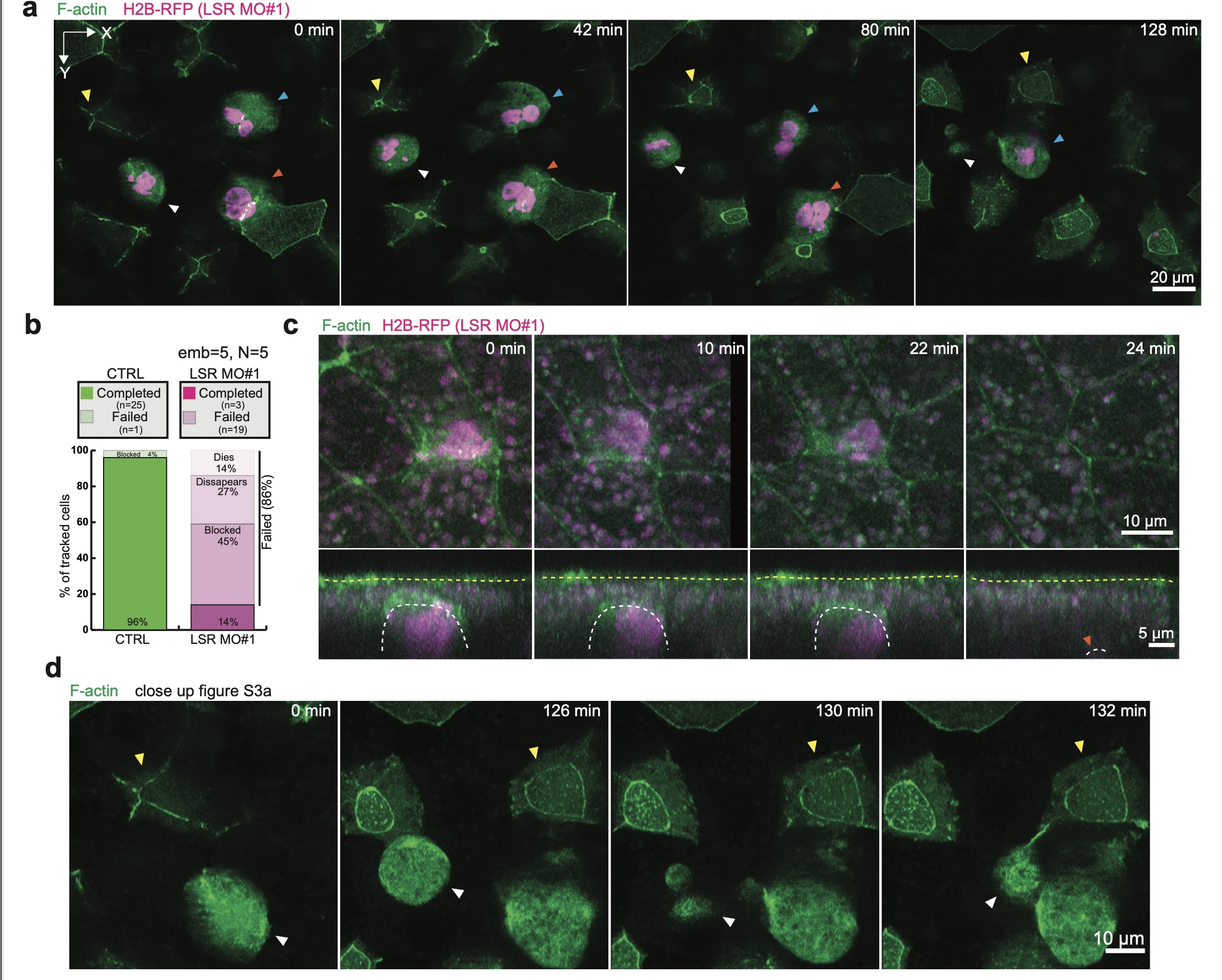 Supplementary Fig. 3 LSR regulates MCC integration. a,c,d, Control and LSR-depleted cells (LSR MO#1, marked with H2B-RFP, pseudo-colored in magenta) expressing LifeAct-GFP (pseudo-colored in green). a, Image sequence of control MCC (yellow arrowhead) and LSR-depleted MCCs. LSR-depleted cells fail to integrate (blocked, cyan arrowhead), migrate back inside the tissue (disappear, orange arrowhead) or undergo cell death (dies, white arrowhead). Scale bar: 20 μm. b, Quantification of integration success rates. LSR-depleted MCCs are either blocked, disappear, or die (nWT= 26 cells, nLSRMO#1 = 22 cells from 5 embryos, N=5 experiments). c, Image sequence depicting disappearance of LSR-depleted MCC (marked by orange arrowhead). d, Image sequence (close-up of figure S3a) depicting cell death of LSR-depleted MCC (marked by white arrowhead). A control MCC is marked by a yellow arrowhead. Scale bar: 10 μm.