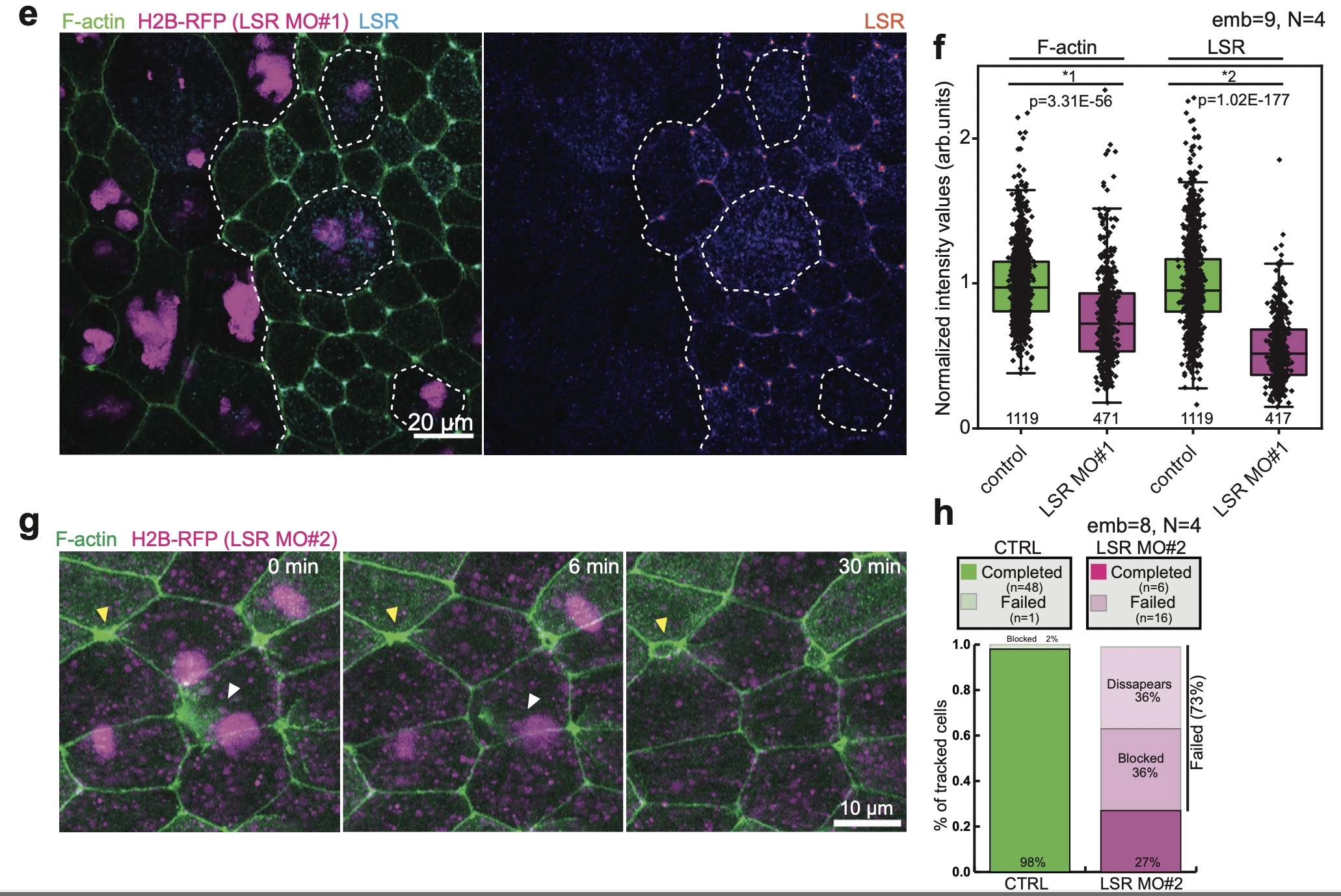 Supplementary Fig. 3 LSR regulates MCC integration. [continued] e, Immunofluorescence images of LSR-stained superficial epithelial layer (F-actin pseudo-colored in green and LSR pseudo-colored in cyan). The white dotted line marks the boundaries between control and LSR-depleted goblet cells (marked by H2B-RFP, pseudo-colored in magenta). f, Distribution of normalized F-actin and LSR intensities in control (in green, total n=1119 vertices, 9 embryos, N=4 experiments) and LSR-depleted cells using LSRMO#1 (in magenta, total n=471 vertices, 9 embryos, N=4 experiments). Boxes extend from the 25th to 75th percentiles, with a line at the median and whiskers representing range within 1.5 interquartile range. Two-tailed Mann-Whitney test with 0.05 significance level *1 p=3.31E-56 *2 p=1.02E-177. g, LSR-depleted cell (LSR MO#2, marked with H2B-RFP, pseudo-colored in magenta) expressing LifeAct-GFP (pseudo-colored in green) fails to integrate (marked by white arrowhead). A control MCC is marked by a yellow arrowhead. h, Quantification of integration success rates. LSR-depleted MCCs are either blocked or disappear (nWT= 48 cells, nLSRMO#2 = 22 cells from 8 embryos, N=5 experiments)