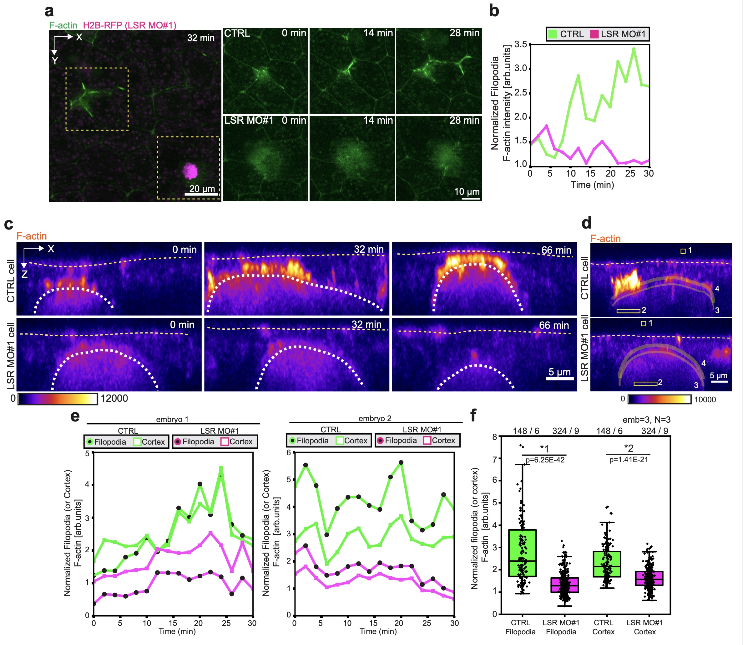 Supplementary Fig. 4 LSR controls F-actin dynamics in MCCs. a,c,d, Control and LSR-depleted cells (LSR MO#1, marked with H2B-RFP, pseudo-colored in magenta) expressing LifeAct-GFP (pseudo-colored in green and as fire as a separate channel). a, F-actin dynamics in control and LSR-depleted MCCs. Scale bar: 20 μm. Yellow boxes mark insets for control and LSR-depleted MCC. Scale bar for insets: 10 μm. b, Quantification of F-actin accumulation at the filopodia normalized to the trailing edge of control (green) and LSR-depleted (LSR MO#1, magenta) MCCs from a (See Supplementary Fig. 4d). c, Orthogonal (XZ) projections used for quantitative analysis of F-actin dynamics in control and LSR-depleted MCCs expressing LifeAct-GFP (pseudo-colored in fire). Mosaic cells were extracted from the same embryo and image gray values were adjusted to the same maximum and minima for visual comparison. d, Representation of the ROIs extracted for quantitative analysis: 1 - background, 2 - trailing edge, 3 - cortex and 4 - filopodia. e, F-actin intensity at the cortex (squares) and filopodia (black circles) normalized to the trailing edge in control (green) and LSR-depleted cells (magenta) f, Box plots representing distribution of normalized F-actin intensities at the cortex and filopodia of control (n=148 timepoints pooled from 6 cells from 3 embryos, N=3 experiments) and LSR-depleted MCCs (n=324 timepoints pooled from 9 cells from 3 embryos, N=3 experiments). Boxes extend from the 25th to 75th percentiles, with a line at the median and whiskers representing range within 1.5 interquartile range. Two-tailed Mann-Whitney test with a 0.05 significance level *1 p=6.25E-42 *2 p=1.41E-21.