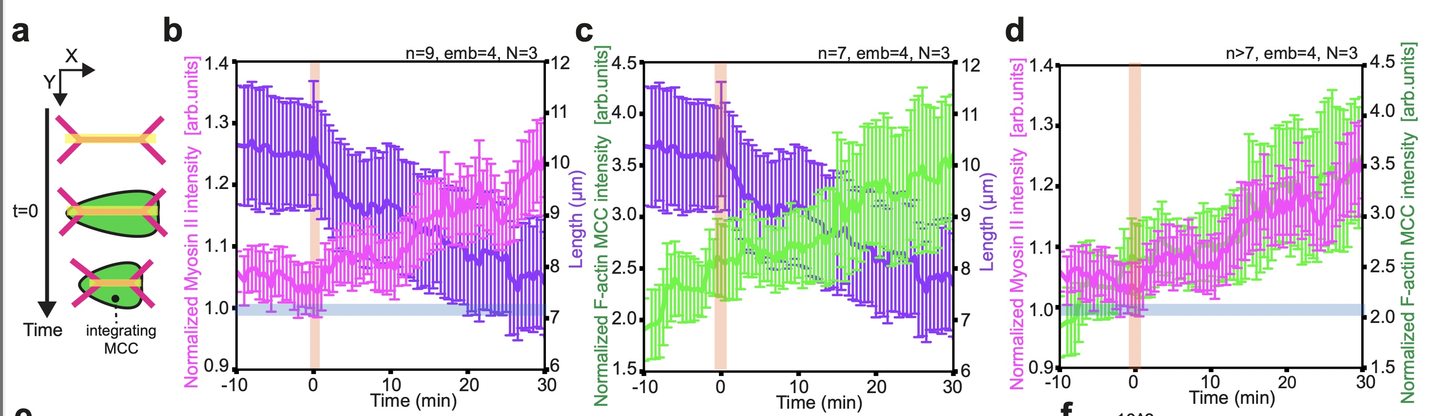 Supplementary Fig. 6 MCCs pull on overlying epithelial vertices to induce junction collapse. a-k, Orange vertical bars and arrowheads mark the onset of epithelial junction collapse, cyan vertical bars and arrowheads mark the onset of junction retraction. a, Schematics representing epithelial junction (in magenta) collapse quantification during MCC (in green) integration. t=0 indicates the start of epithelial junction collapse, which coincides with MCC reaching the overlying junction. b, Average normalized junctional myosin-II intensity (magenta) and junction length (purple) before and during junction collapse (t=0, the start of junction collapse)(n=9 junctions from 4 embryos, N=3 experiments). c, Average normalized MCC F-actin intensity (green) and junction length (purple) before and during junction collapse (t=0, the start of junction collapse)(n=7 junctions from 4 embryos, N=3 experiments). d, Normalized junctional myosin-II intensity (magenta) and normalized MCC F-actin intensity (green) during junction collapse (t=0, the start of junction collapse)(n>7 junctions from 4 embryos, N=3 experiments).