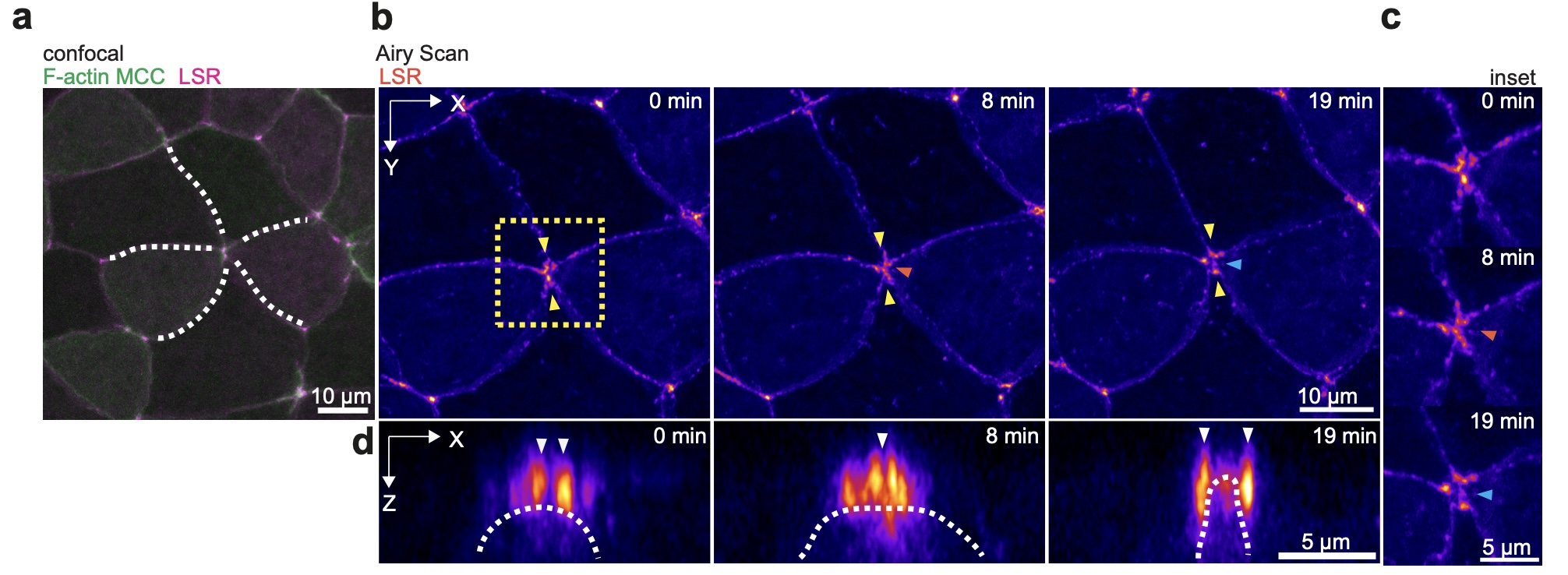 Supplementary Fig. 7: Live Superresolution Imaging of Rosette formation. Rosette formation during MCC integration. a, Confocal image of a rosette formation event which was then imaged using the Superresolution mode of the Airy Scan module (Airy Scan). b-d, Airy Scan imaging of rosette formation. Orange arrowheads marks formation of multi-fold vertex and blue arrowheads marks initiation of apical expansion. b, Epithelial vertices can be distinguished before (timepoint 0 min) and after MCC integration (timepoint 19 min). During integration (timepoint 8 min) the LSR strings cannot be easily distinguished from the LSR accumulated at the leading edge of the MCC. Yellow box outlines close-up in c and white arrowheads mark orientation of orthogonal projections in d. c, Close-up on rosette formation. d, Orthogonal (XZ) projections of rosette formation during MCC integration. White arrowheads mark vertex position.