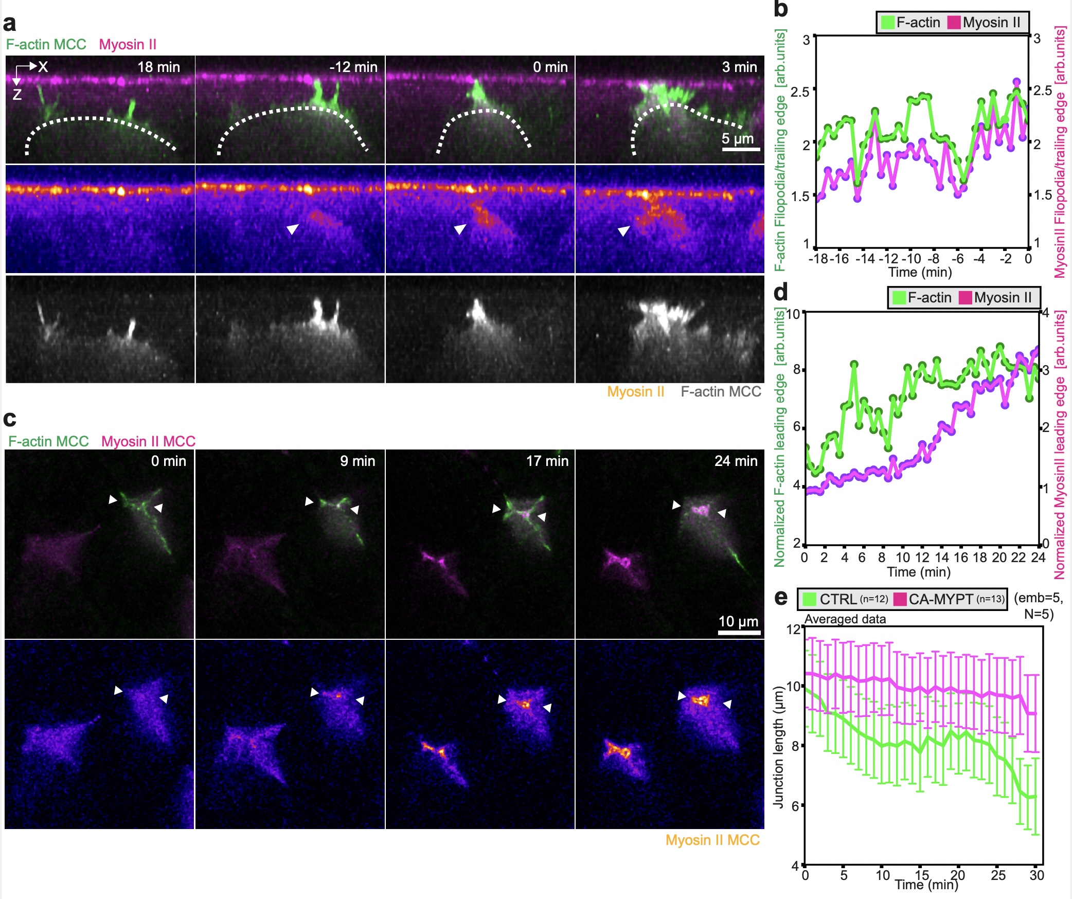 Supplementary Fig. 8 Myosin II is recruited to the leading edge of MCCs during probing and junction remodeling. a, Orthogonal (XZ) projections of myosin II recruitment to the MCC leading edge during integration. MCC is labeled with α-tubulin::LifeAct-RFP (pseudo colored green in a composite image, pseudo colored in gray as a single channel) and myosin II is labeled with myosin intrabody SF9-3xGFP (pseudo colored magenta in the composite image and pseudo colored in fire as a single channel). Scale bar: 5 μm. t=0 marks the last tracked frame during integration. b, Normalized myosin-II intensity (magenta) and normalized MCC F-actin intensity (green) at the leading edge of integrating MCC. (Also see Fig. 5b) c, Image sequence depicting myosin recruitment in MCC during junction remodeling. White arrowheads depict myosin accumulation. MCC is labeled with α-tubulin::LifeAct-RFP (pseudo colored green in a composite image, pseudo colored in gray as a single channel) and myosin II is labeled with myosin intrabody SF9-3xGFP (pseudo colored magenta in the composite image and pseudo colored in fire as a single channel). d, Normalized myosin II intensity (magenta) and normalized MCC F-actin intensity (green) at the leading edge of inserting MCC. e, Average junction length for control and CAMYPT-overexpressing MCCs after MCCs reached the overlying junctions, t=0 (nWT= 12 junctions, nCAMYPT = 13 junctions, N=5 experiments). Data show mean ± SEM.