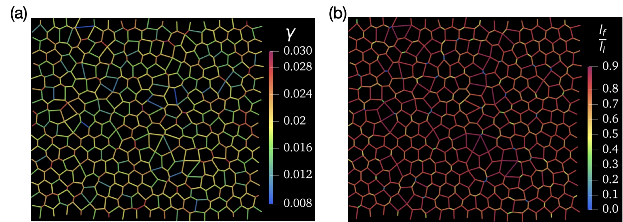 Supplementary Figure 9. Edge collapse due to line tension perturbations. (a) Initial configuration is defined as force-balanced tissue configuration with heterogeneous line tensions with average < >= 0.02. (b) The line tension of each edge i is perturbed to i+0.2< >. Then we find the new force balance configuration and by calculating the ratio of final edge length to initial length before perturbation lf /li, we find that bonds with higher line tension and shorter length are more likely to collapse (see Supplementary Note 1).