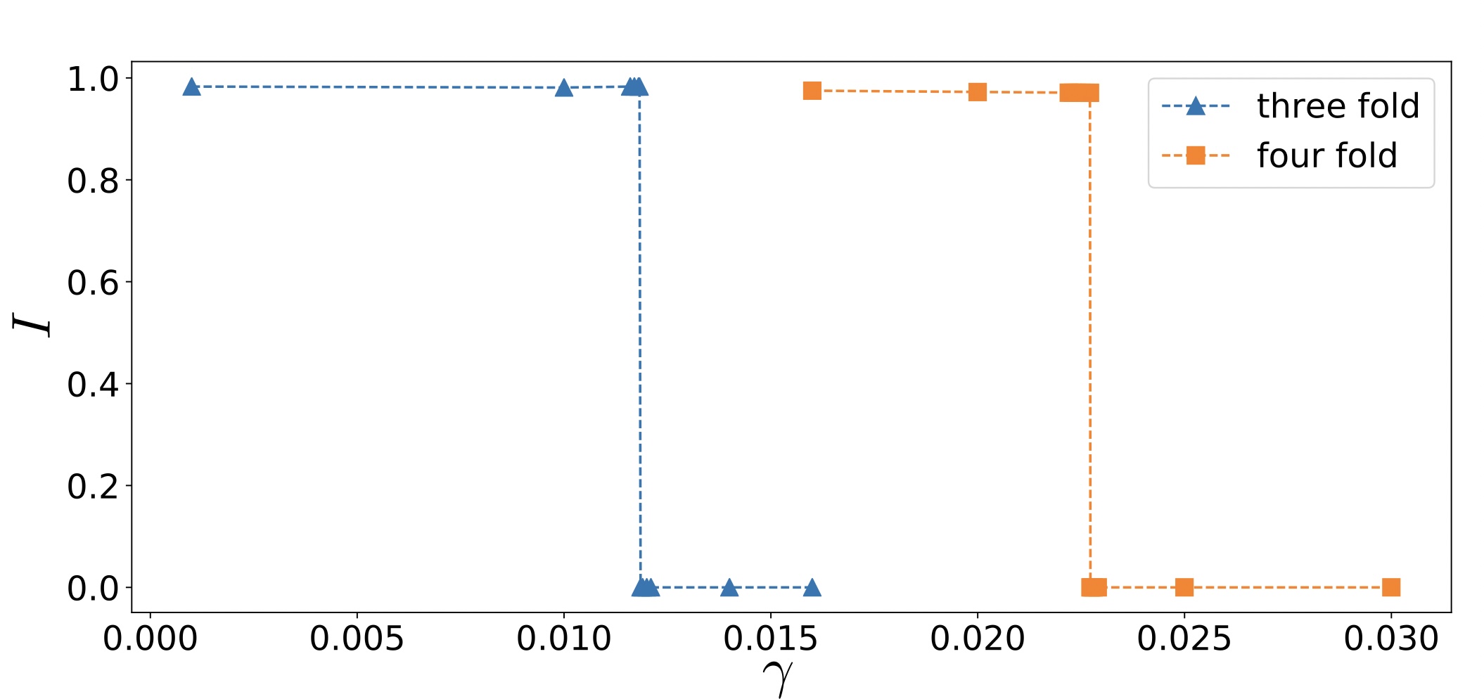 Supplementary Figure 11. Comparing the line tension criteria for MCC intercalation by computing the order parameter I, defined as the ratio of area of intercalated cell at force balance to the cell preferred area, for three-fold (blue) and four-fold (orange) vertices. The calculations are done in a hexagonal cellular network with a uniform line distribution (see Supplementary Note 1).