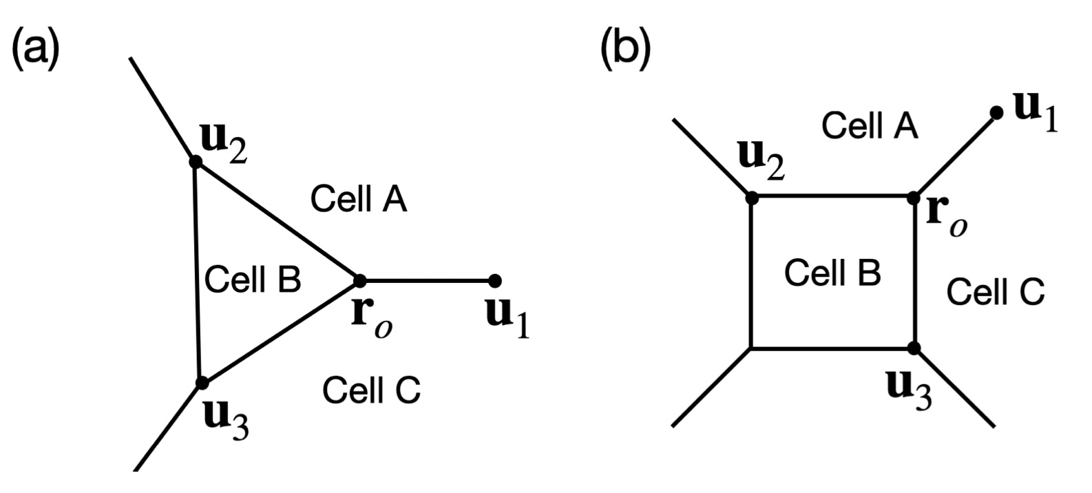 Supplementary Figure 12. Schematics of symmetric insertion of cell B at a three-fold vertex (a), and at a four-fold vertex (b) at location ro. Upon integration, each vertex of cell B is subject to forces stemming from the line tension of the 3 connected bonds in directions u1 ro, u2 ro and u3 ro and the pressure di↵erence between cell B and its neighboring cells A and C (see Supplementary Note 1).