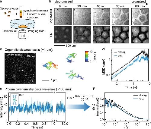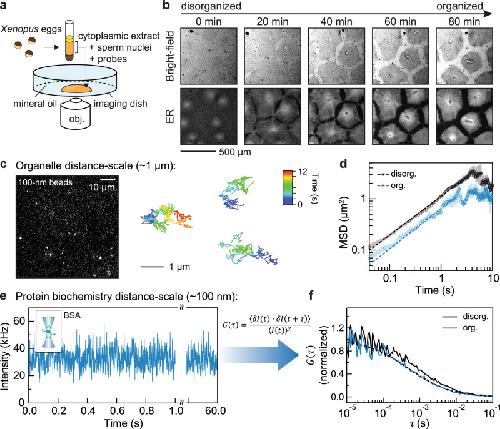 Figure 1. a Schematic of the experimental setup used in this study: Xenopus laevis eggs were fractionated to obtain the undiluted cytoplasmic extract, which was then deposited on the surface of an imaging dish and covered with mineral oil. b Time-lapse images of the self-organizing cytoplasm, visualized with 1 µM ER-Tracker Red dye. c Image (left) of dilute 100-nm (diameter) microspheres in extracts. Trajectories (right) are examples from single-particle tracking in the organized cytoplasm (interior regions in Fig. 2a). The relative positions between the three tracked particles were adjusted for display (they were tens of microns apart in the extracts). d Ensemble mean squared displacement (MSD) analysis derived from the single-particle tracking. Shaded area, standard error of the mean (SEM). Dashed lines are fitting to MSD(t)=Γtα, where Γ is the generalized diffusion coefficient34. The fitted {Γ, α} for disorganized and organized cytoplasm are {1.12, 0.75}, and {0.65, 0.78}, respectively. The localization error of these SPT experiments, quantified with immobilized microspheres, was below 0.01 µm2 (Supplementary Fig. 1a). e, f Representative FCS data of BSA-Alexa Flour 488 in cytoplasmic extracts. The full intensity trajectory (60 s) is shown in Supplementary Fig. 2c. The inset depicts a molecule diffusing through a confocal spot. G(τ) is the autocorrelation function, where τ is the lag time; δI(t)=I(t)−⟨I(t)⟩, where I(t) is the fluorescence intensity and the brackets denote time averages. The autocorrelation curve was fitted by an anomalous diffusion model (dashed line). In this example, the number of particles was 42, and the average intensity (shown in e) was 32 kHz, corresponding to a molecular brightness of 0.76 kHz/molecule. Source data are provided as a Source Data file.