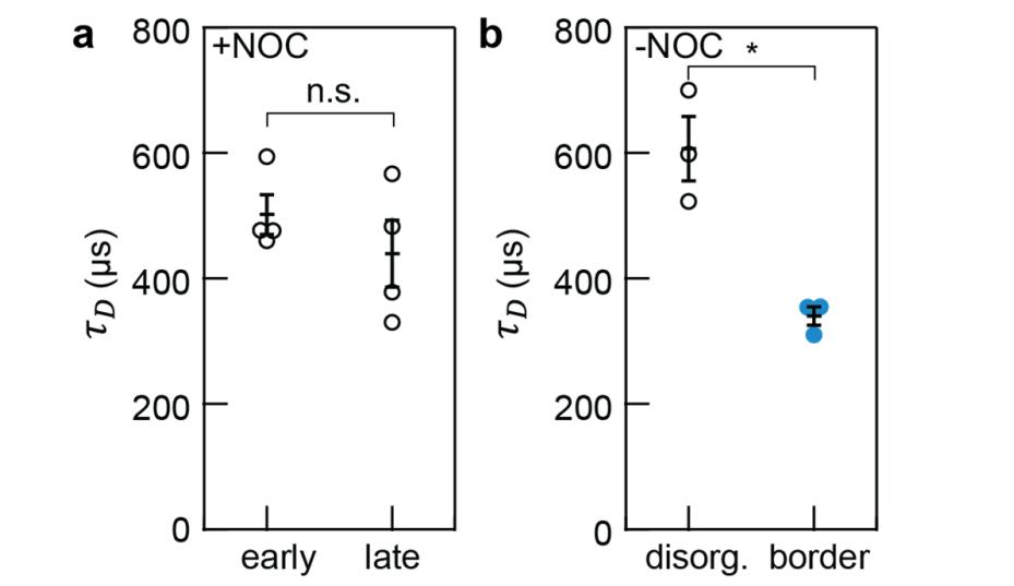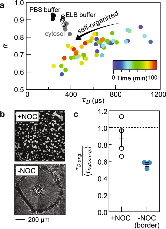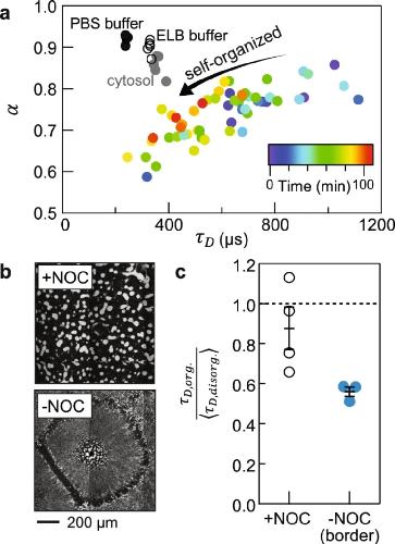 Figure 3. a FCS data from Fig. 2c–e consolidated in a parameter space of {α, τD}. b Nocodazole (NOC, 33 µM) abolishes self-organization of cytoplasm, visualized by ER-Red Tracker. c Nocodazole-treated cytoplasmic extracts show little changes in diffusion time (diffusion time ratio close to 1), compared with the sample without nocodazole at similar timepoints (<5 min). The y-axis shows τD normalized by the average τD from early timepoints (<20 min). Error bars, SEM. n = 4 and three measurements of different positions in an extract with and without nocodazole, respectively. Source data are provided as a Source Data file.