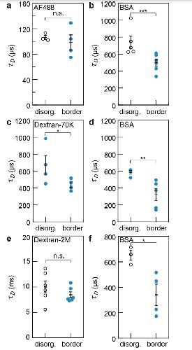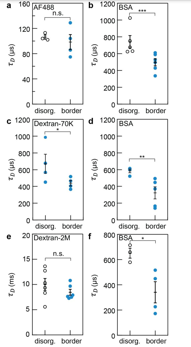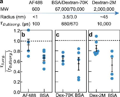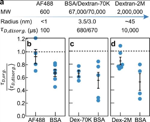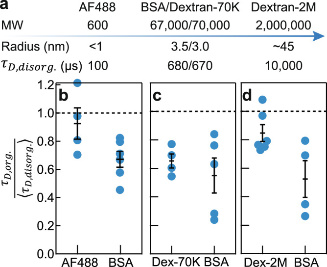 Figure 4. a Molecular sizes of probes used in this study. b–d Normalized diffusion times of Alexa Fluor 488 dye (AF488), dextran-MW70,000 (Dex-70K), and dextran-MW2,000,000 (Dex-2M) in organized cytoplasmic extracts. These experiments focused on the border regions of the organized cytoplasm such that data collected <10 min could be better compared. Each panel shows data from two droplets of extracts prepared from a single batch of eggs; BSA diffusion was taken as a standard for comparison. Error bars, SEM. n = 4, 6, 4, 5, 6, and 4 measurements of different positions in an extract for data from left to right, respectively. Source data are provided as a Source Data file.