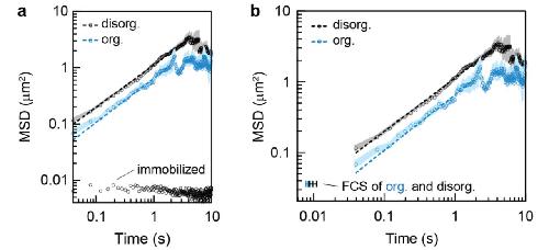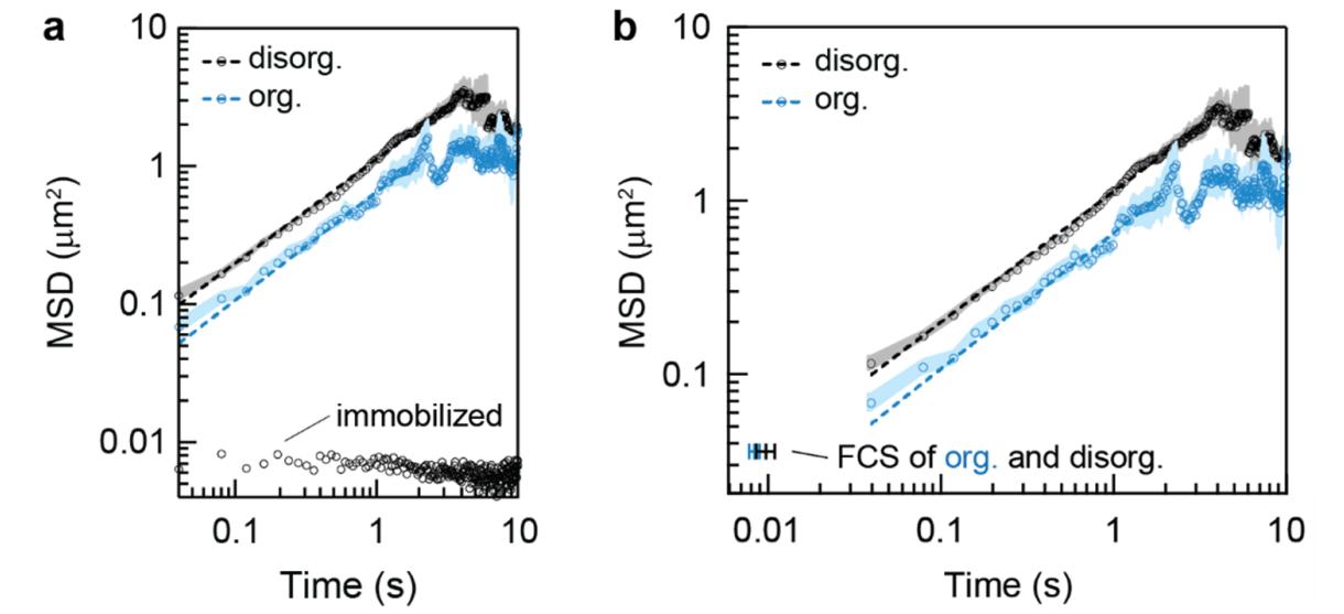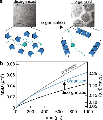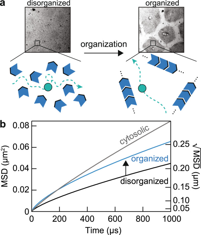 Figure 6. a Schematic of the model: molecular and organelle reorganization optimizes molecular diffusion by creating longer mean free paths for diffusing molecules. The green object represents a protein of interest diffusing in the cytoplasm; the blue objects represent obstacles in the cytoplasm, such as organelles, cytoskeleton elements, and macromolecular complexes. In this model, proteins in organized cytoplasm remain free to diffuse in all directions. b Diffusion effects of molecular reorganization illustrated with mean squared displacement, MSD (t) = Γtα. The parameters {Γ, α} estimated for disorganized cytoplasm, organized cytoplasm and the cytosol are {8, 0.75}, {8.25, 0.70}, and {30, 0.85}, respectively. Note that based on the tradeoff between diffusion times and subdiffusivity in the organizing cytoplasm (Fig. 3a), we have assumed that the acceleration of protein movements over these distance scales comes at a cost of slower dynamics over longer distance scales. We also limit the comparison around the length scale of FCS measurements (~0.1–0.5 µm) since protein dynamics may show distinct characteristics at shorter and longer distance scales. Source data are provided as a Source Data file.