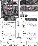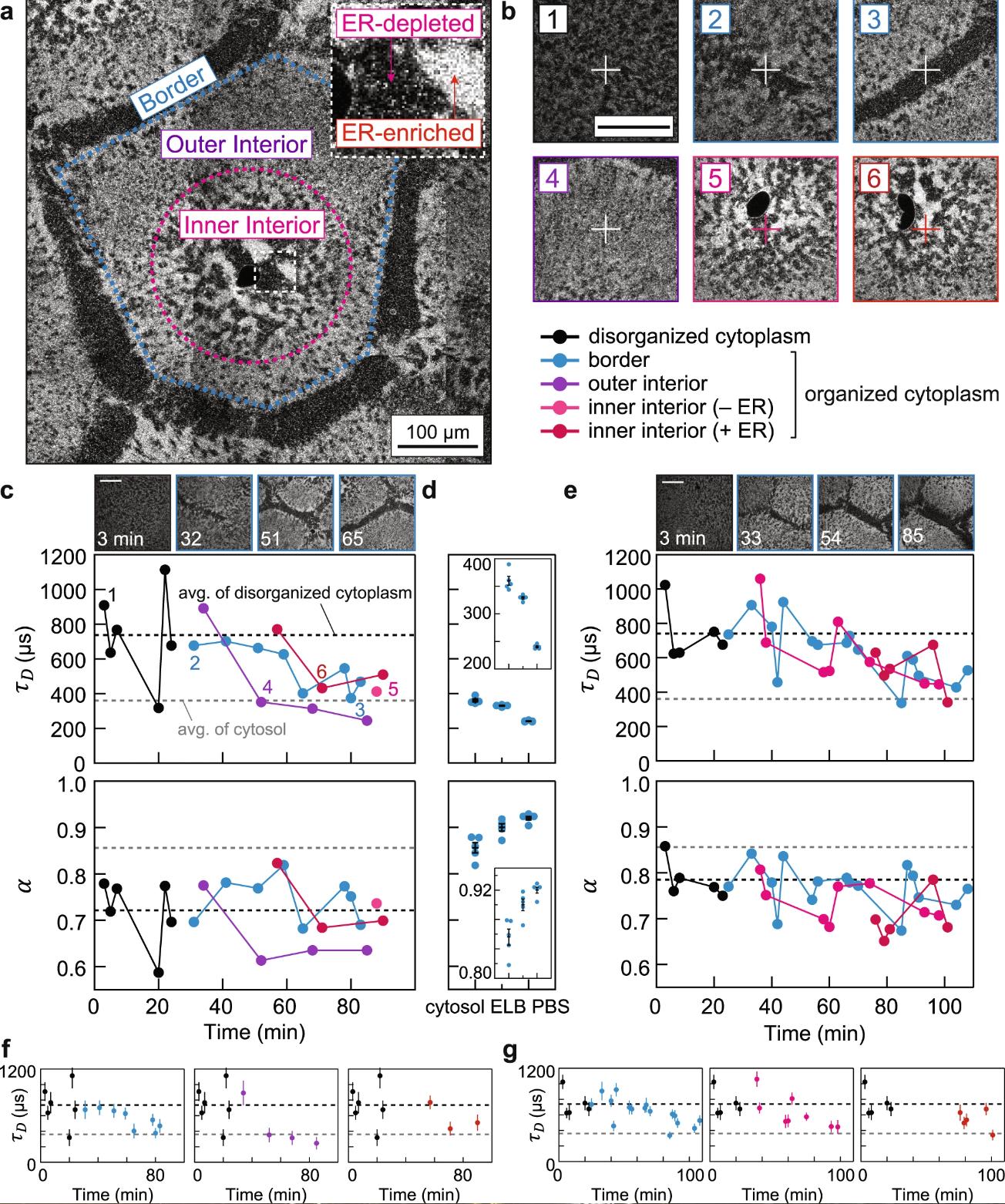 Figure 2. a, Spatial regions of self-organization (color-coded), classified by the ER morphology. The dark sphere near the center of the inner interior is the nuclei. The image was stitched from multiple confocal images. b Representative confocal images of FCS foci, which are marked by the crosshairs. The annotated numbers refer to snapshots taken prior to FCS measurements in c. c Tracing protein diffusion during self-organization by FCS. The plots show the characteristic diffusion times τD and the diffusion mode α obtained from fitting the FCS curves. Black and gray dashed lines correspond to averages from disordered cytoplasmic extracts (in this example, 740 µs, Deff = 11.9 µm2/s) and cytosolic extracts (360 µs, Deff = 24.7 µm2/s), respectively. d Benchmark measurements from cytosolic extracts and buffers. ELB, egg lysis buffer; PBS, Phosphate-buffered saline. Insets show zoom-in of the data. Each condition was measured five times; all data presented by error bars are mean ± SEM. n = 5 measurements of different positions in a sample. e, Biological repeat of c, prepared from a separate batch of eggs. f, g are isolated traces from c and e. Error bars, estimated errors (standard deviation) from curve fitting (each fitting was performed over n = 107 data points). Scale bars, 100 µm. Source data are provided as a Source Data file.