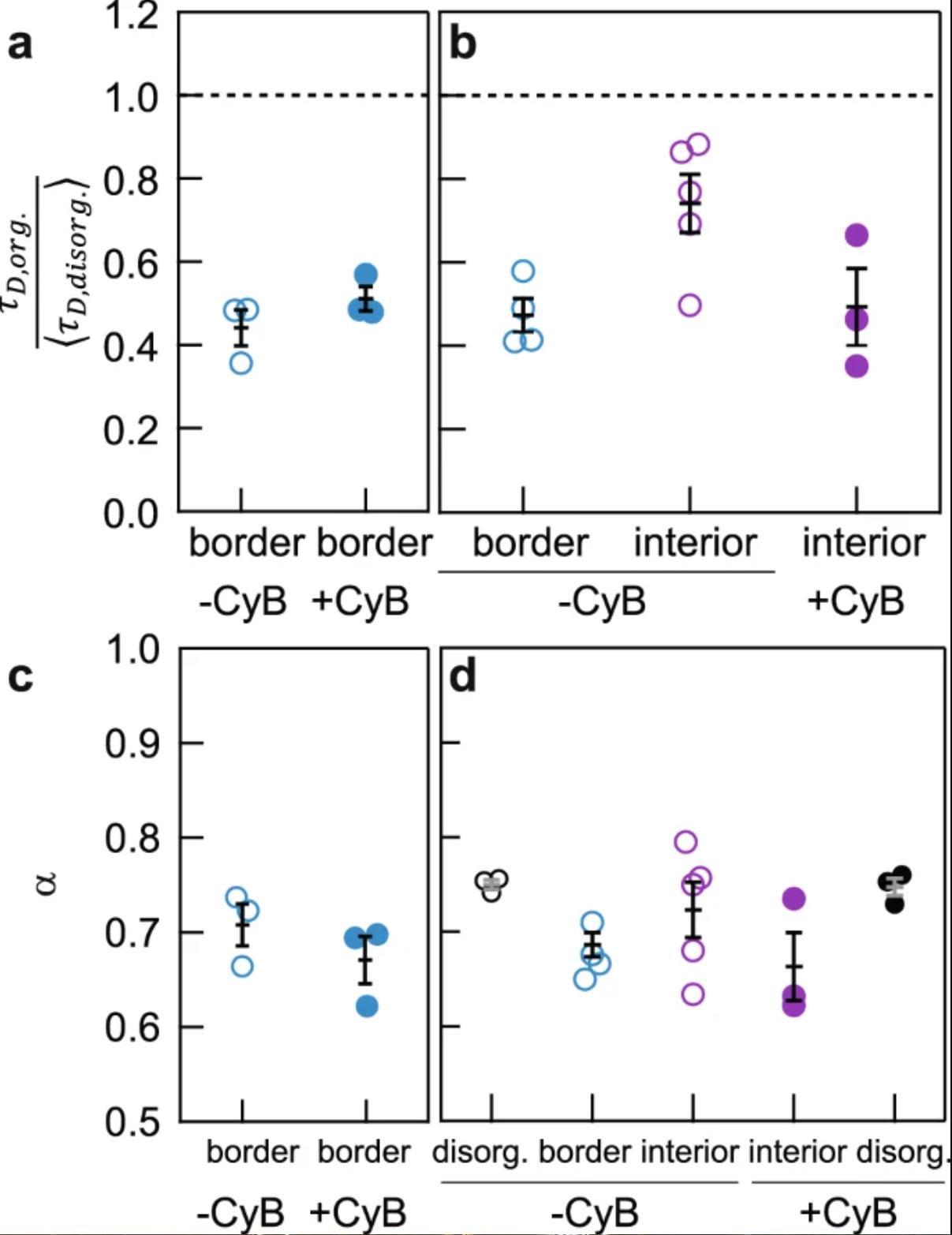 Figure 5. a, b Normalized diffusion times of BSA in actin-intact extracts, prepared without the addition of cytochalasin B (CyB). Note that the diffusion rate did not increase more during the self-organization of actin-intact extracts (open circles) than it did in actin-inhibited extracts (solid circles). The two panels are two independent experiments. c, d Degree of subdiffusion in actin-intact and actin-inhibited extracts. Data shown in panel c and d are from the same experiment shown in panel a and b, respectively. Error bars, SEM. n = {3, 3, 4, 5, 6; 3, 3, 3, 4, 5, 6, 3} measurements of different positions in an extract for data from left to right and top to bottom, respectively. Source data are provided as a Source Data file.